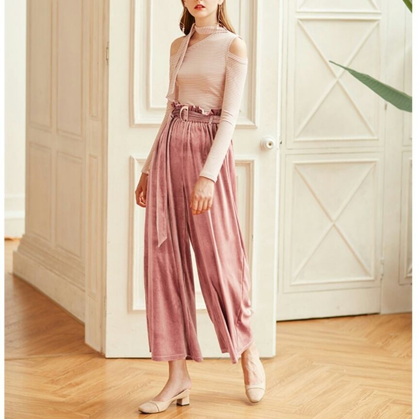 ワイドパンツとも相性がよいタイトなボーダーリボントップス