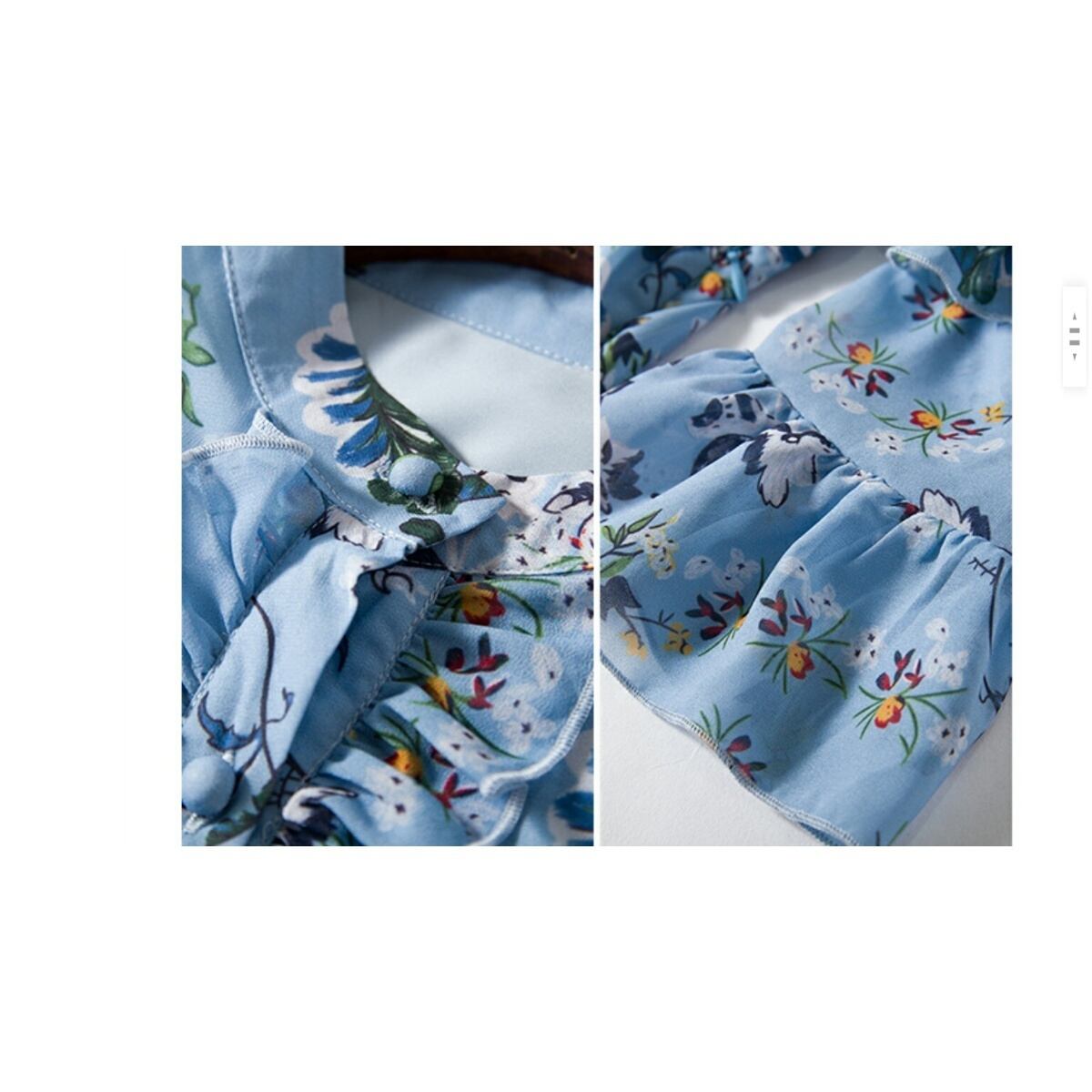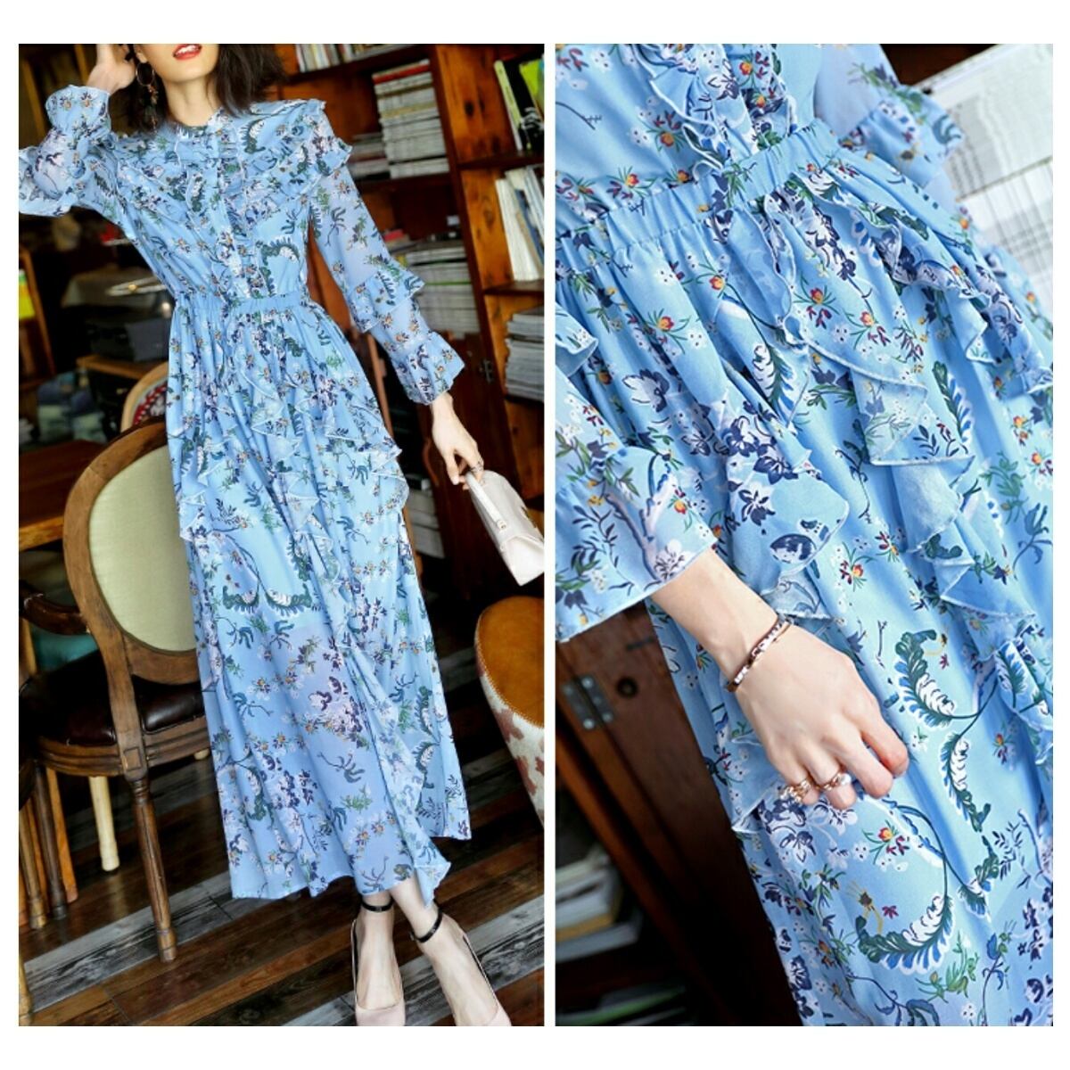 フリル&ドレープのかわいい花柄模様シャツ風のロングワンピース