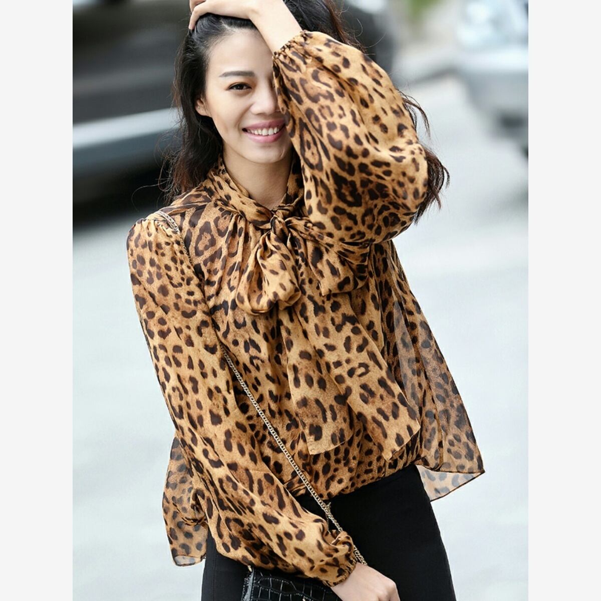 新作 高品質♪2色/レオパード柄タイ付シアートップス