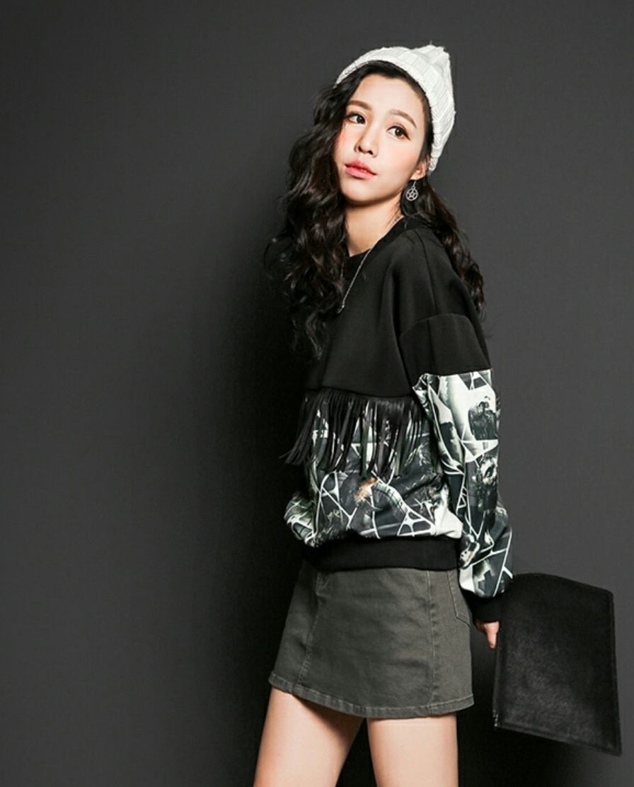 新作 オシャレ♪フォト風プリント切替フリンジトップス