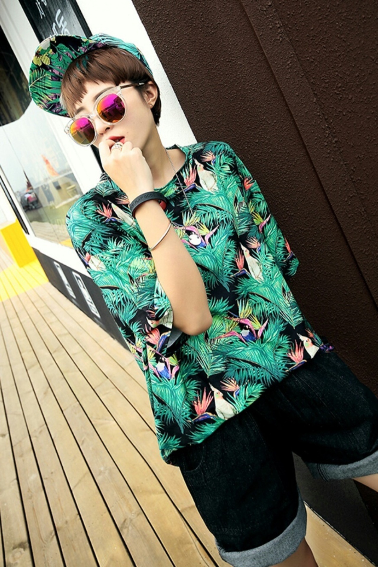 新作 オシャレ♪2色/ユニークリーフ&小鳥Tシャツ