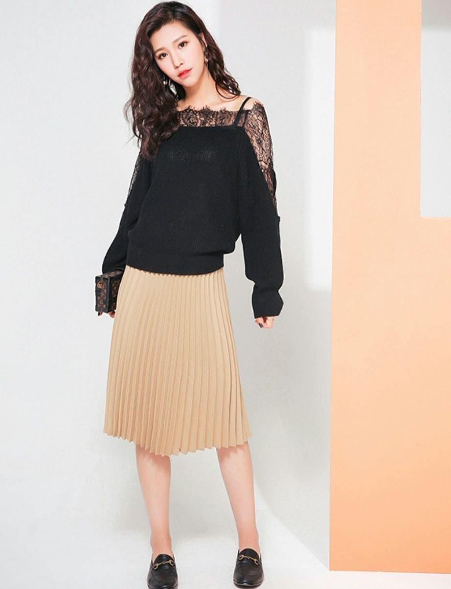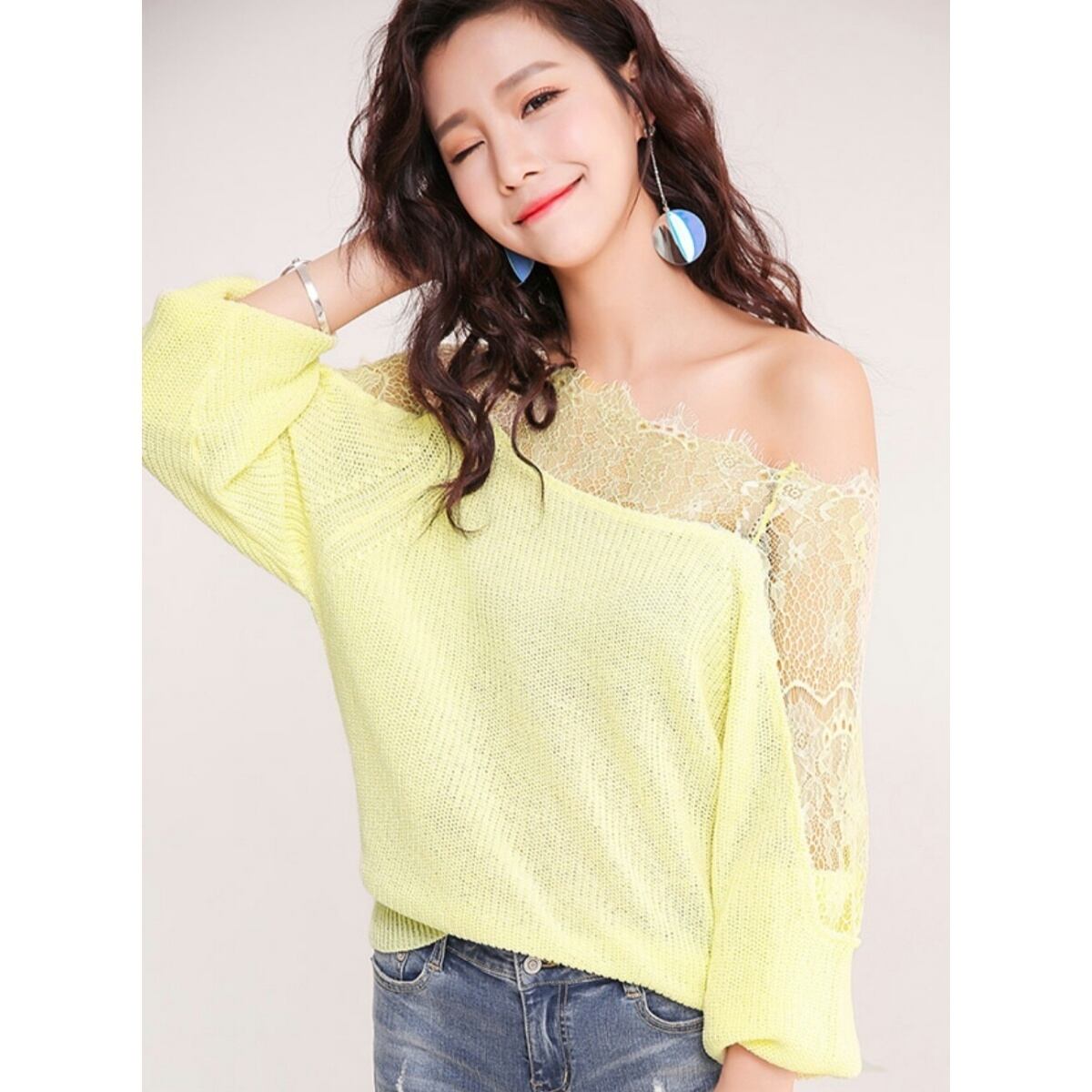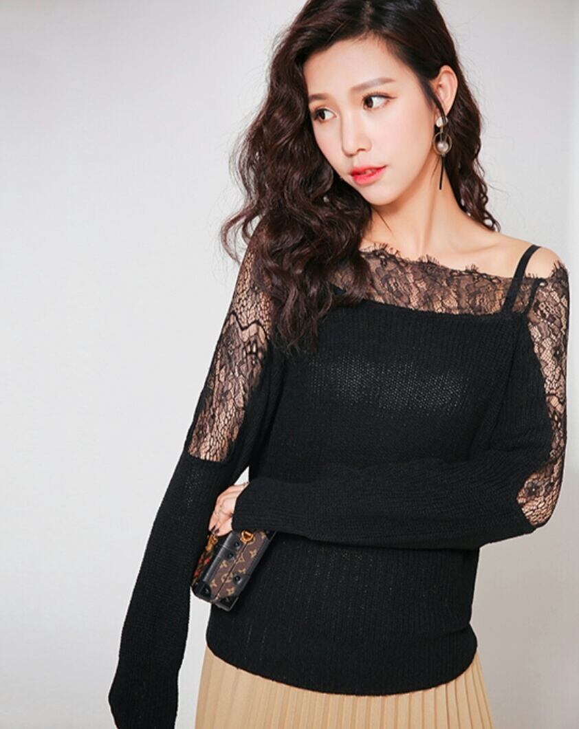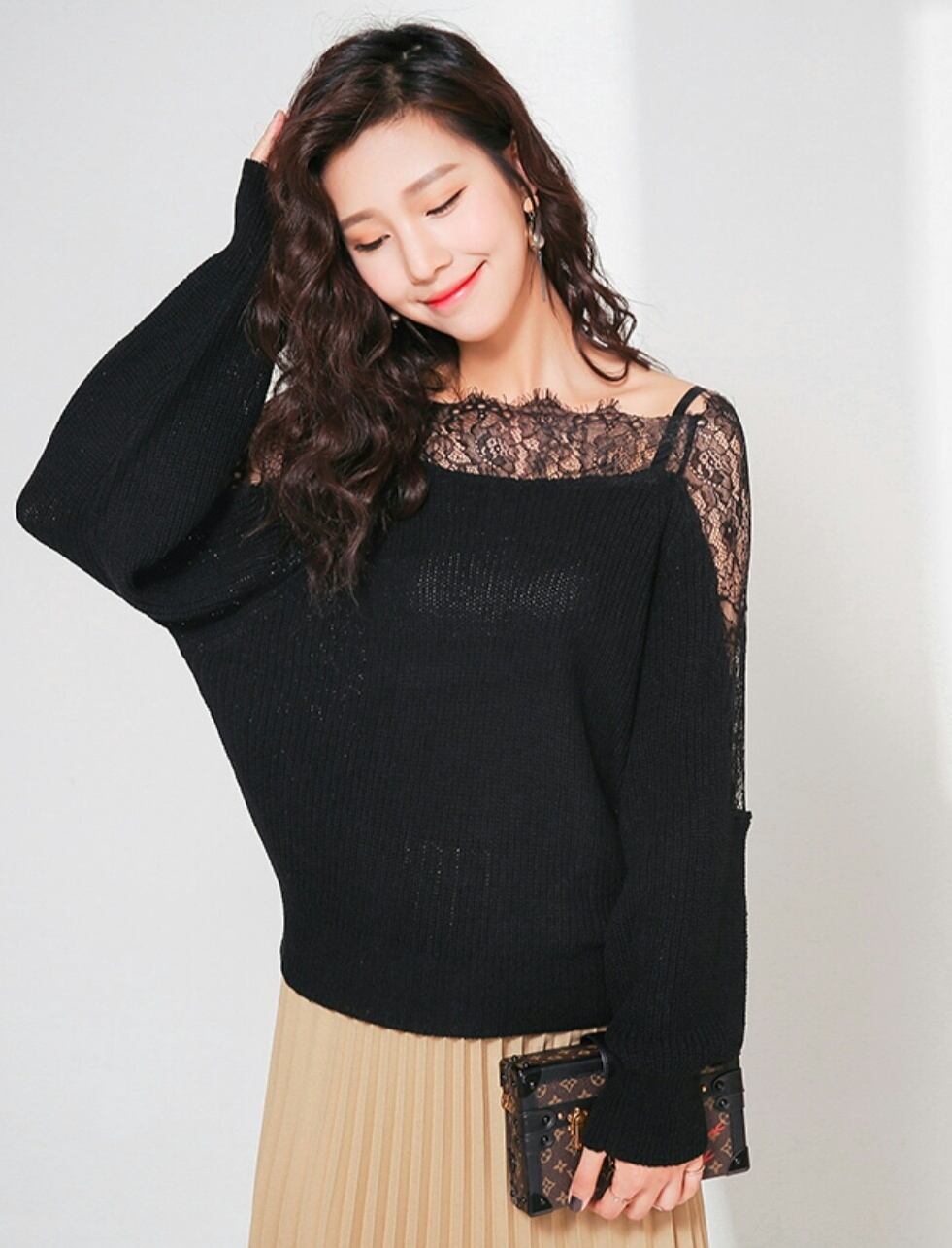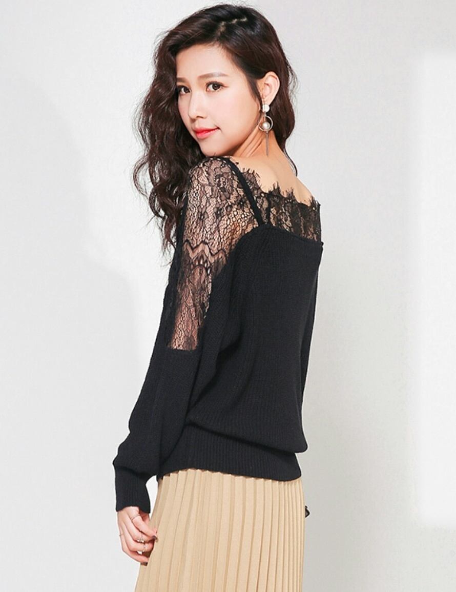 新作 オシャレ♪2色/ポイントレース切替ニットトップス