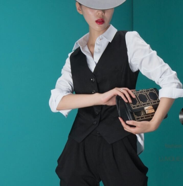 シャツとのレイヤードコーデと相性がいい黒のシンプルベスト