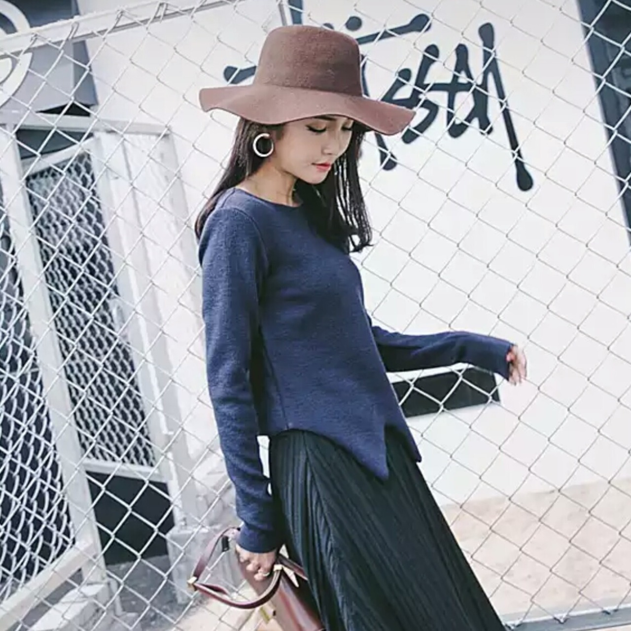 ヘムラインカットボトムでニュアンスが楽しい青黒ニットトップス