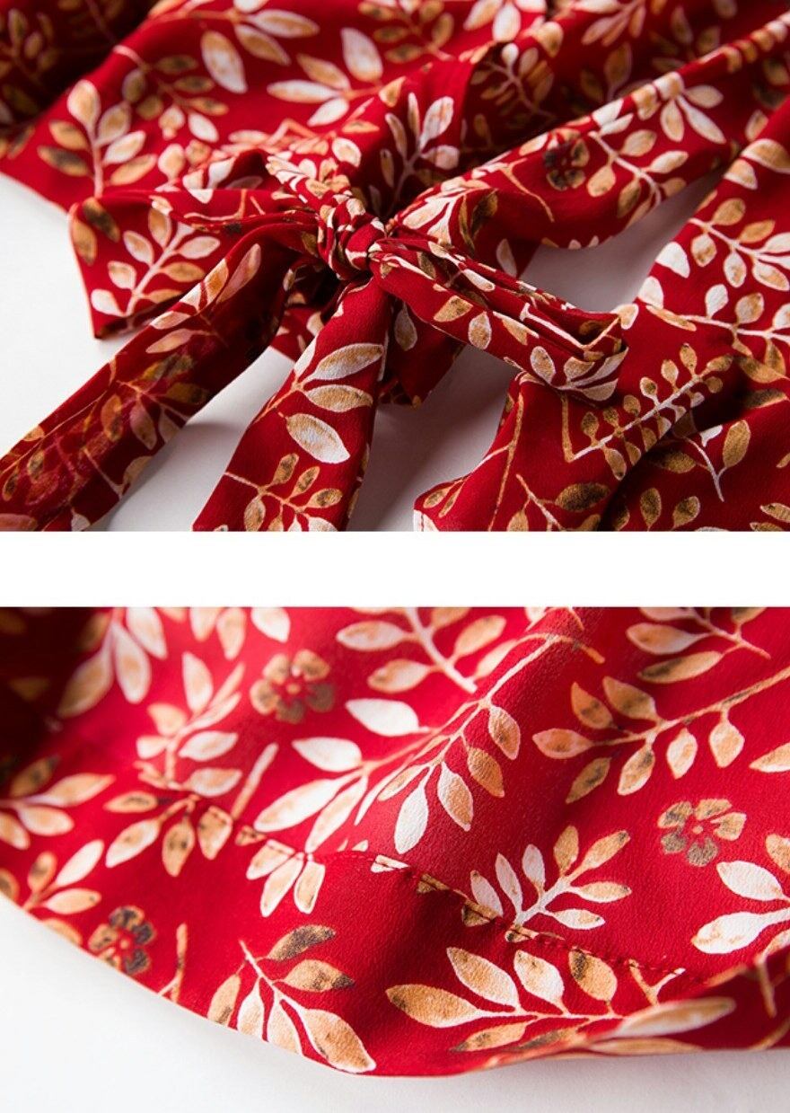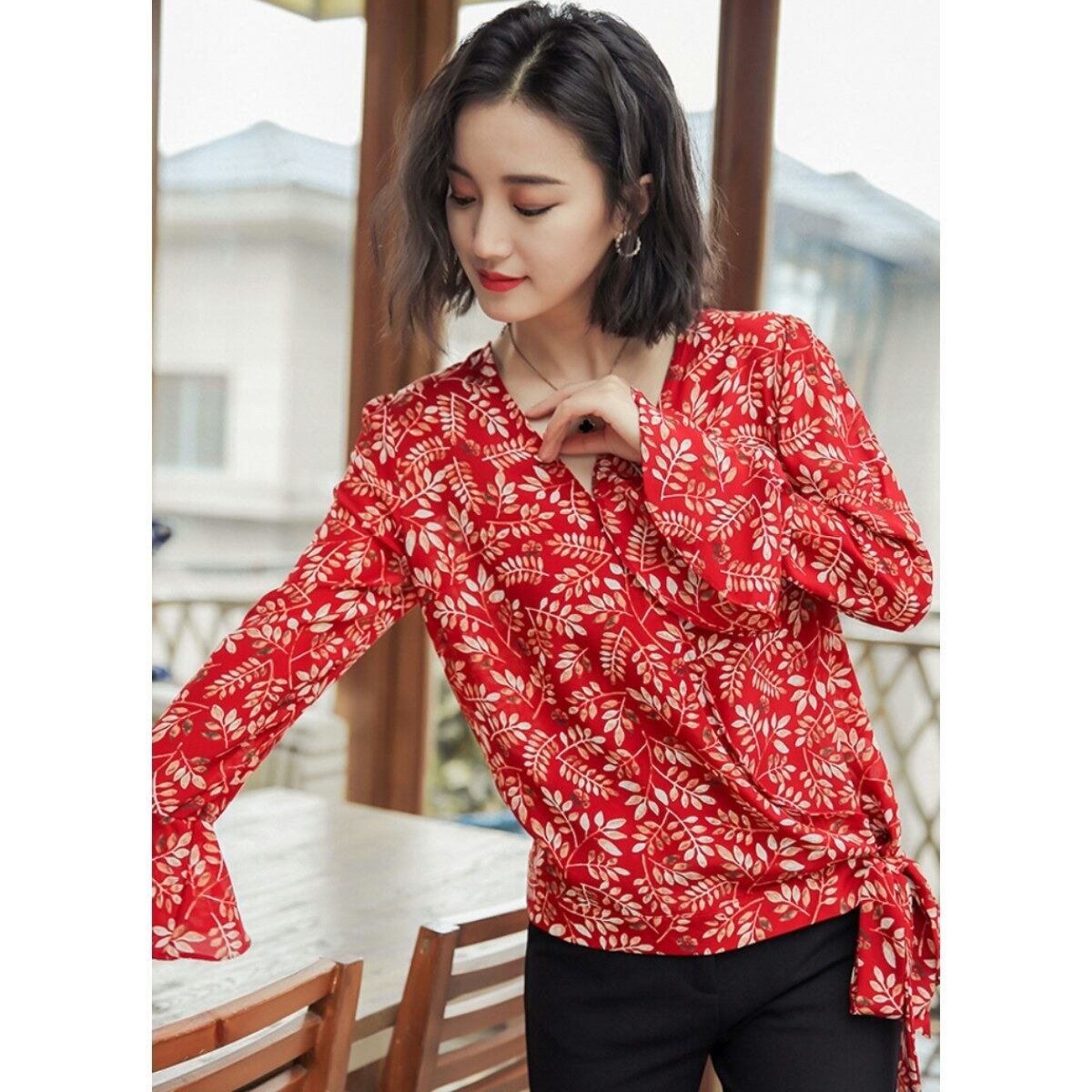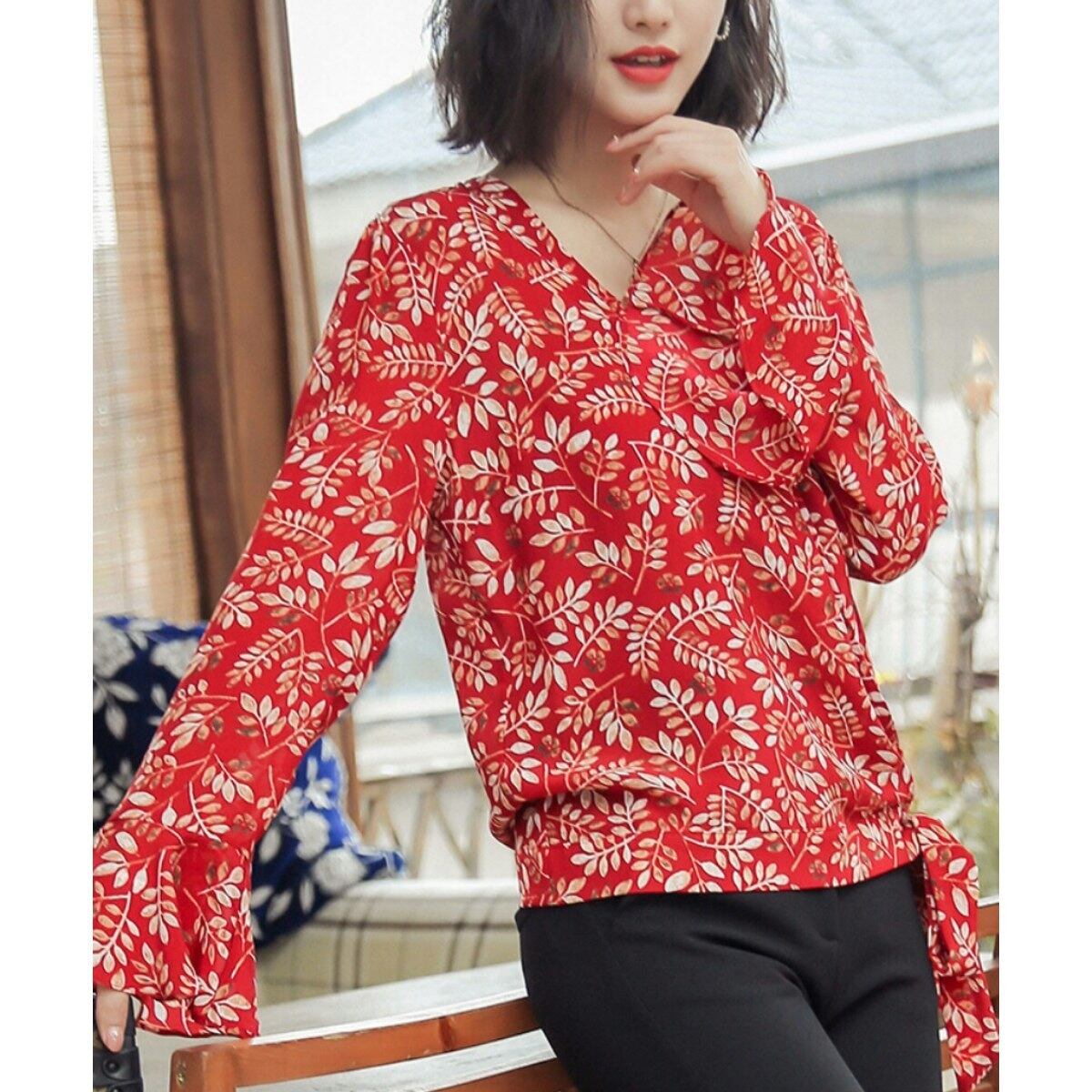 袖フレアのエレガントなフォルム葉っぱモチーフVネック赤シャツ