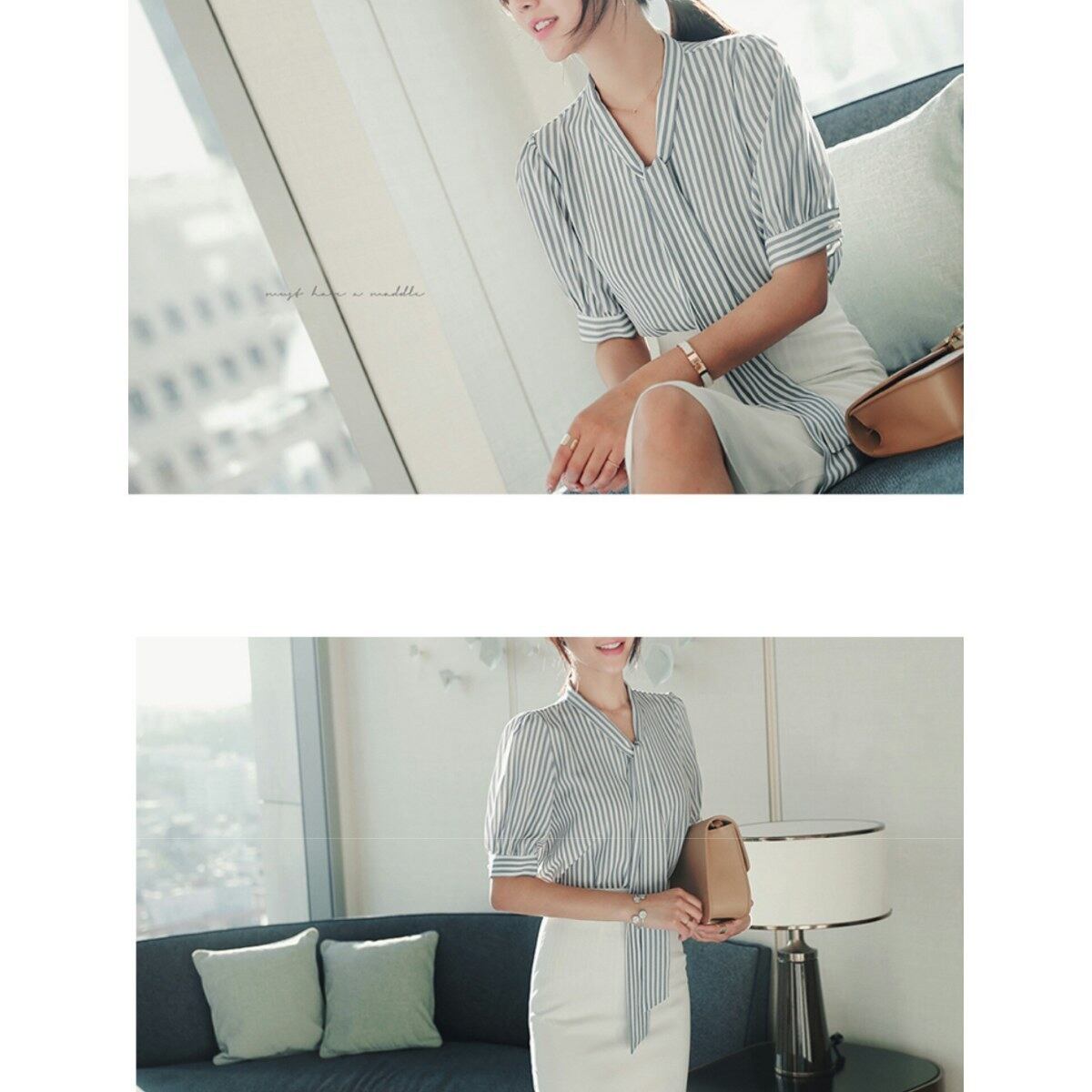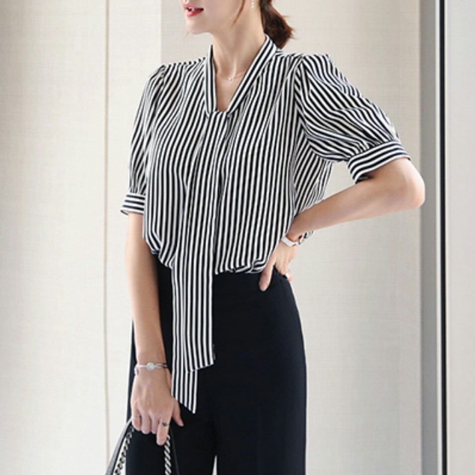 夏のオフィスカジュアルにおすすめ/タイ付ストライプトップス