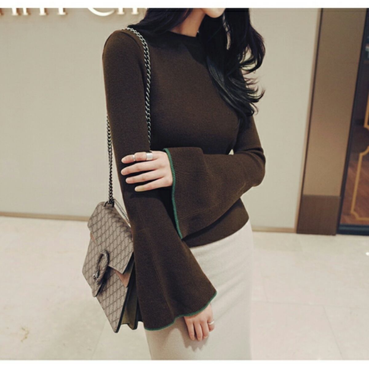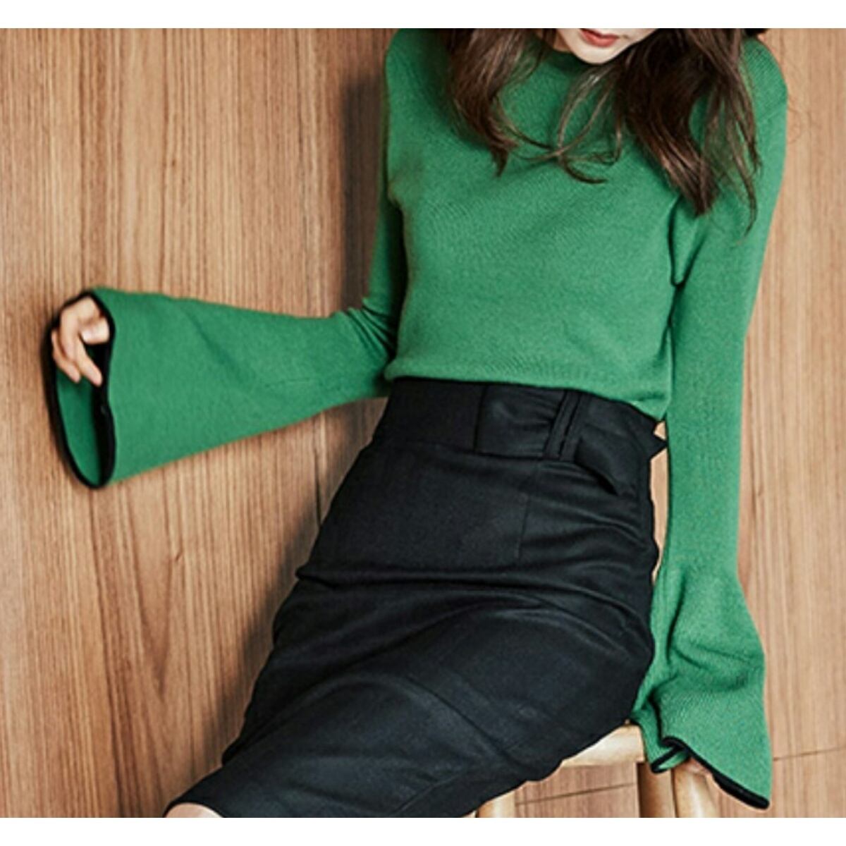 こちらの商品は袖長めのフレアが洗練された女性らしさを演出してくれるかと思います。緑と茶色の2種類でございますので、貫禄さと知的な雰囲気も醸し出しそうですね。ボトムス次第で様々な雰囲気を楽しめるかと思いますので、お客様のお好みのスタイルを是非、見つけて頂きたいものです。