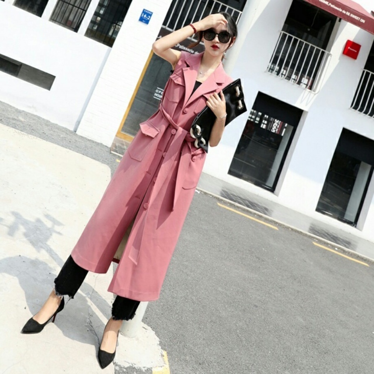 ウエストマークポケット有ヒップまで隠れるロング丈ピンクベスト