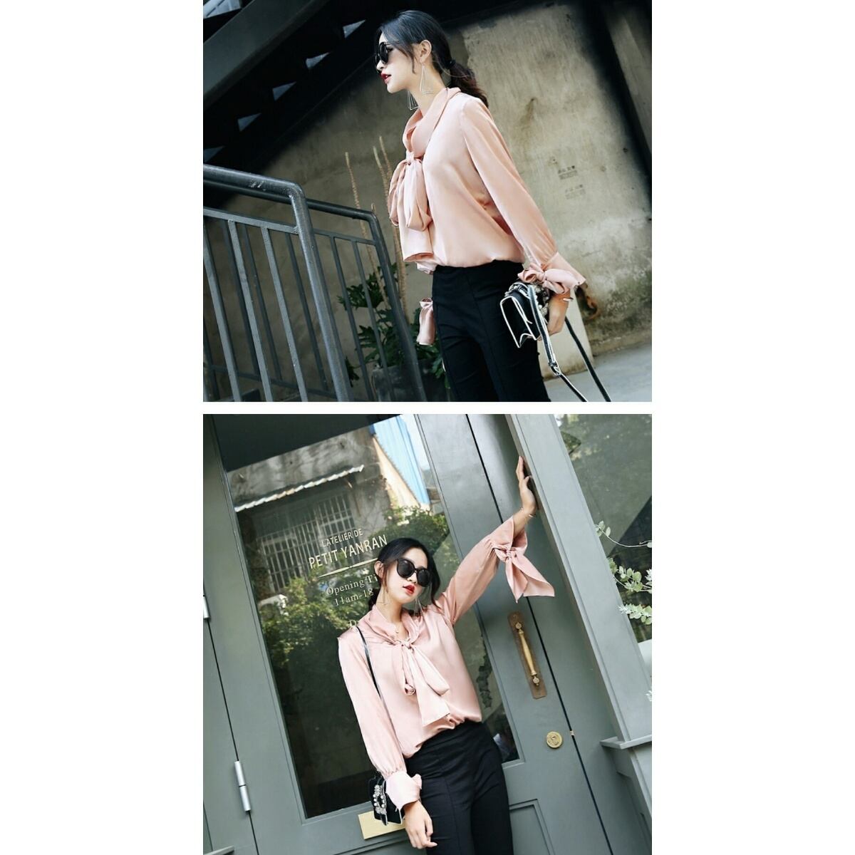 艶のある上品なカラータイ付きナチュラルなサイズのブラウス