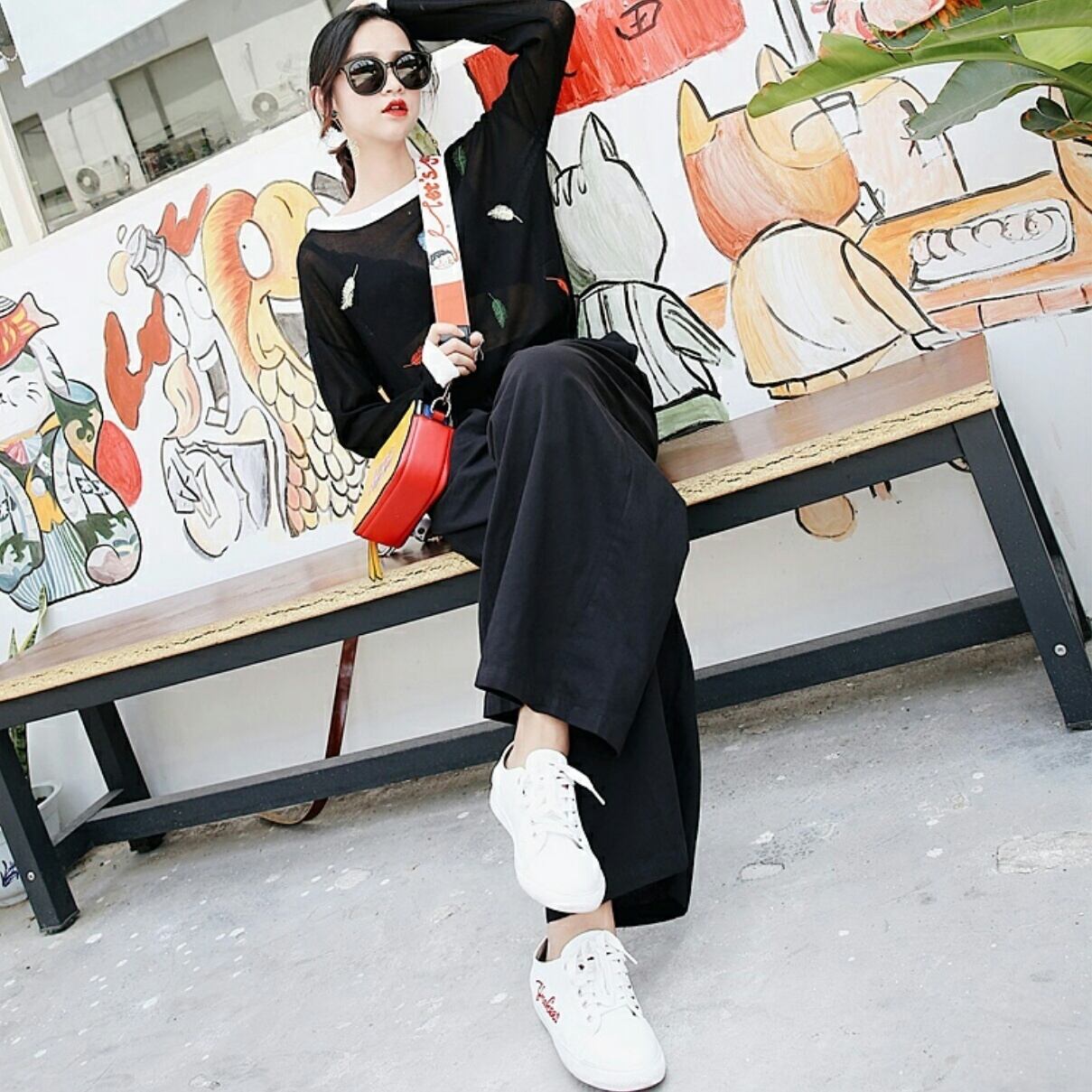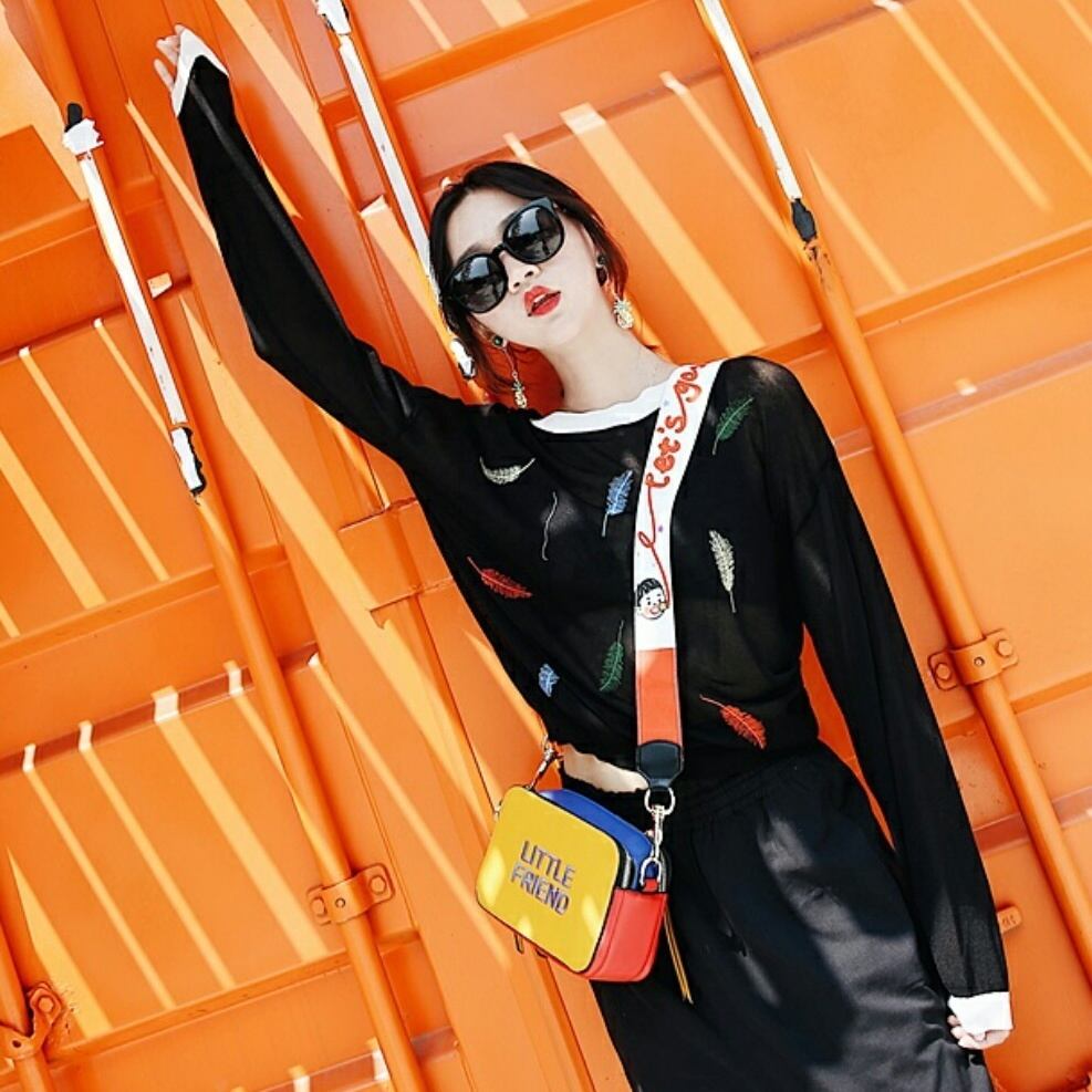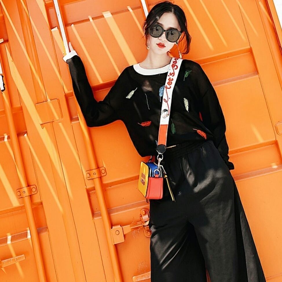 マルチカラーフェザー刺繍模様/薄手ニットクルーネックトップス
