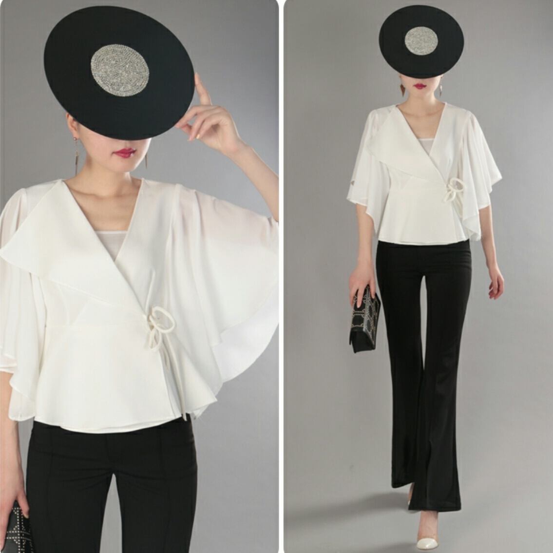 ケープ風のフォルム/袖フレアのカシュクールVネックトップス