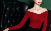 肩ライン綺麗に演出/大きくあいたVネックトップス黒/ワイン