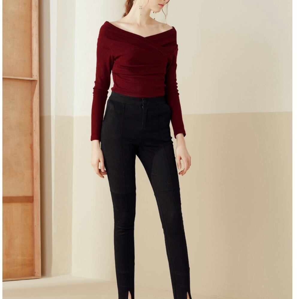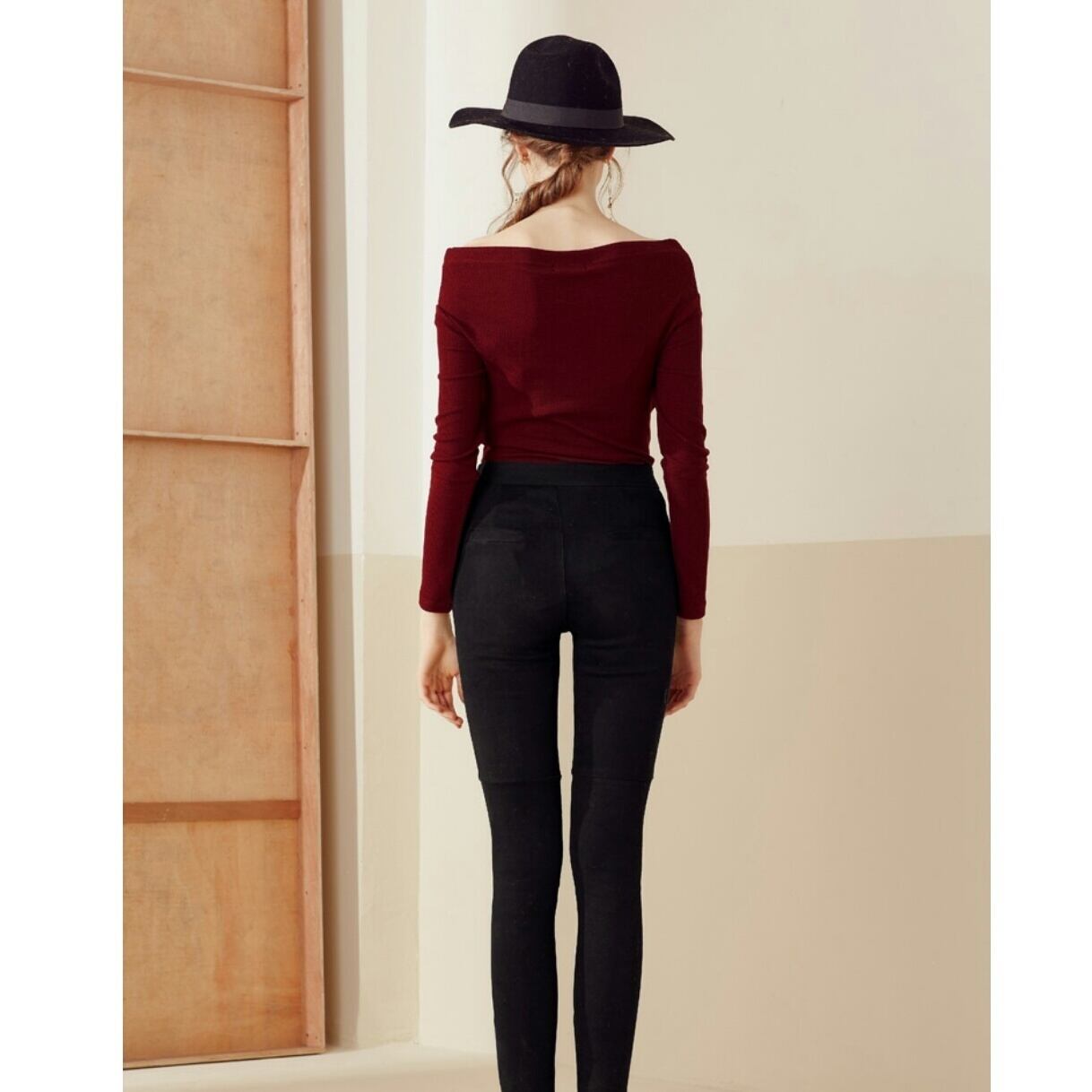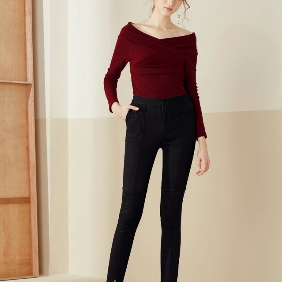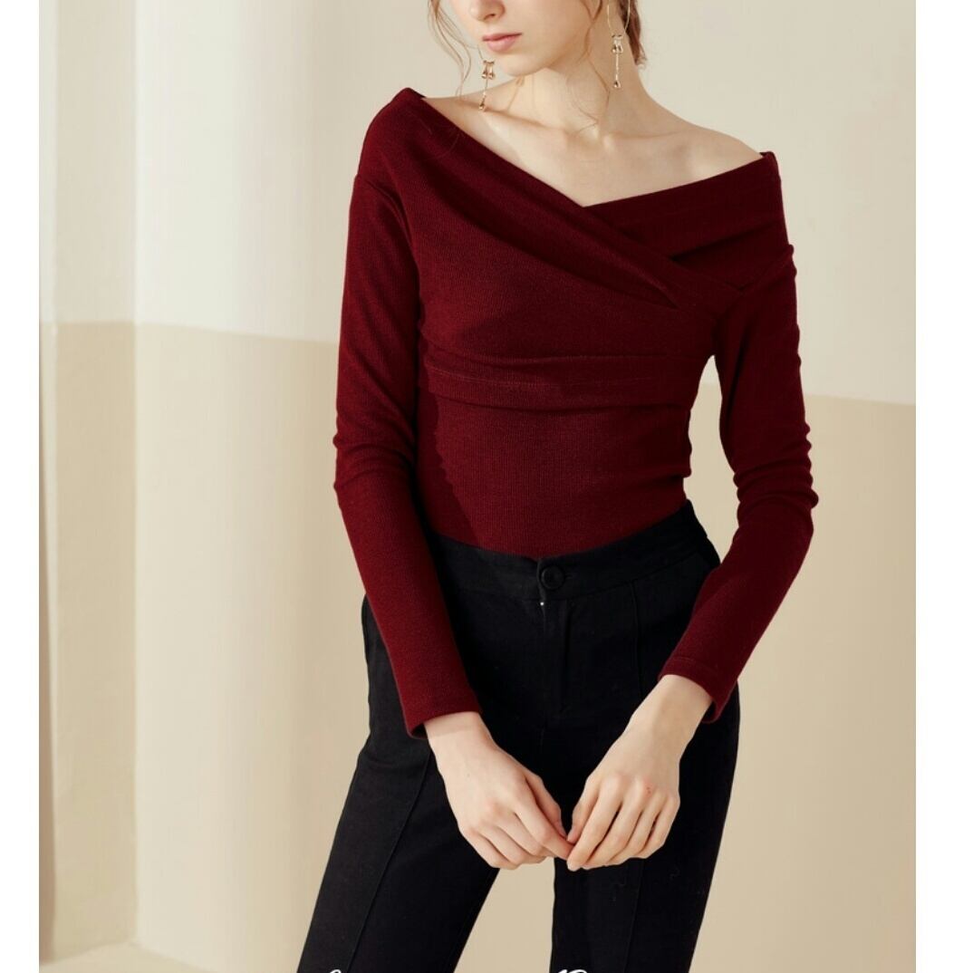大きくあいたVネックバストクロスのタイトトップス黒/ワイン