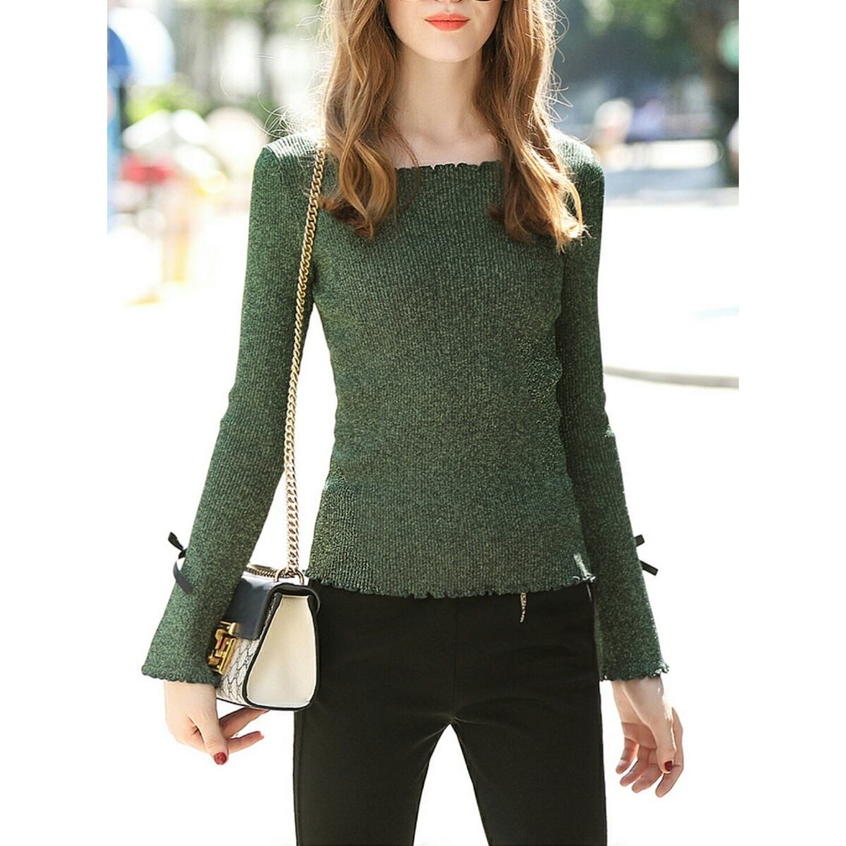 シャイニーカラーが綺麗な袖スリットニットトップス緑/グレー