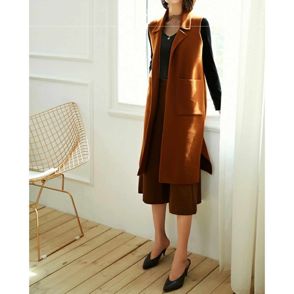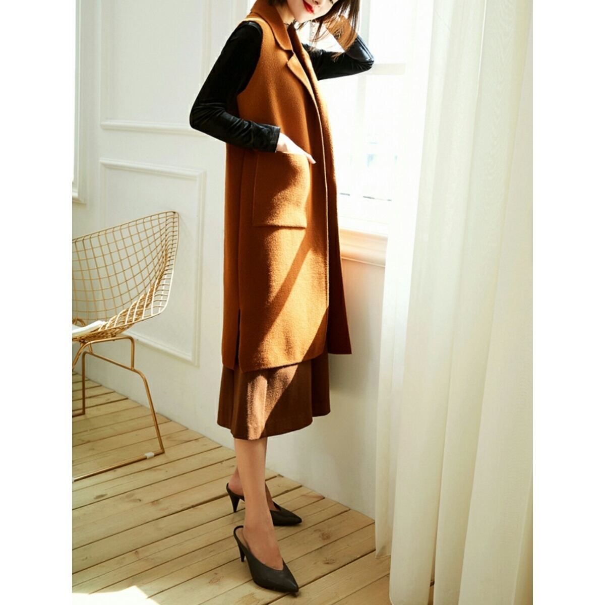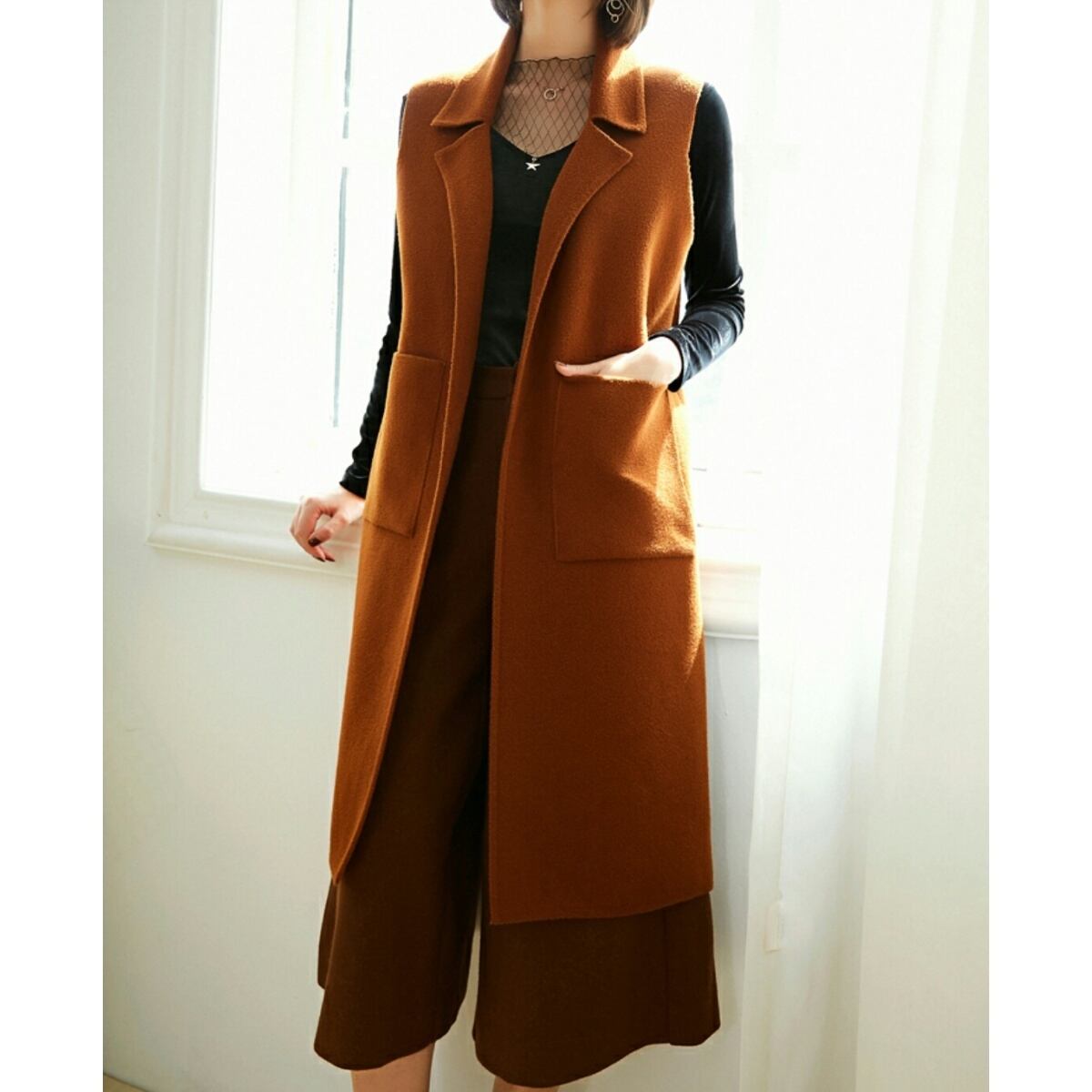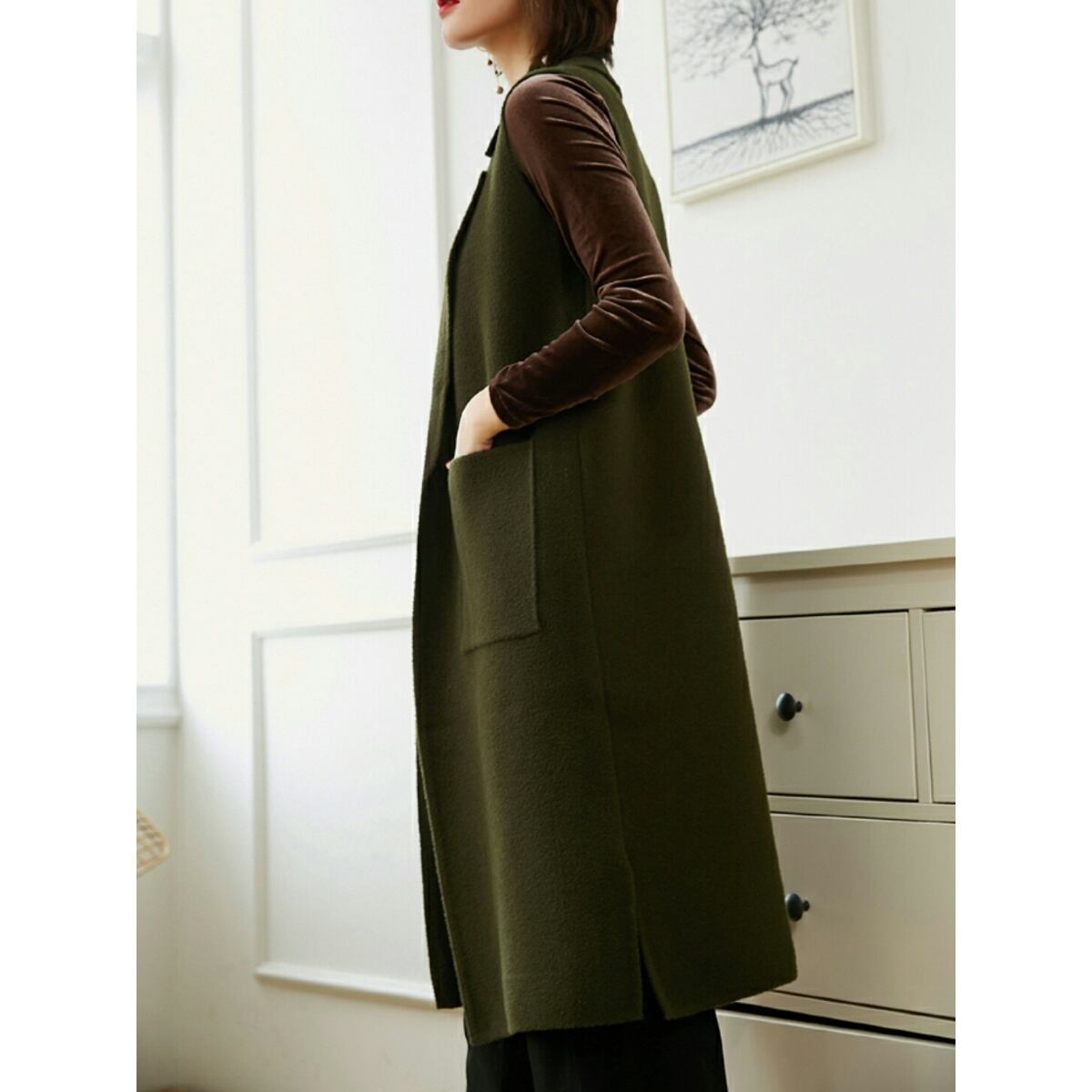 手が入る大きいパッチポケットシンプルなロングベスト茶/緑