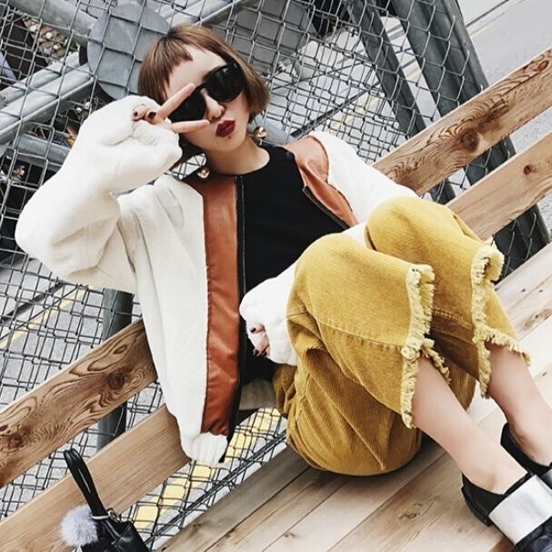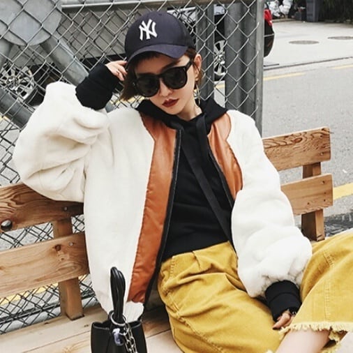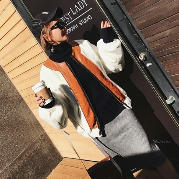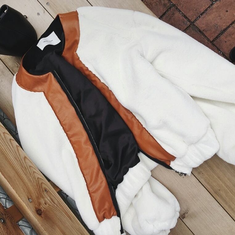 ふわふわ白素材にフェイク・レザーを添えた異素材アウター