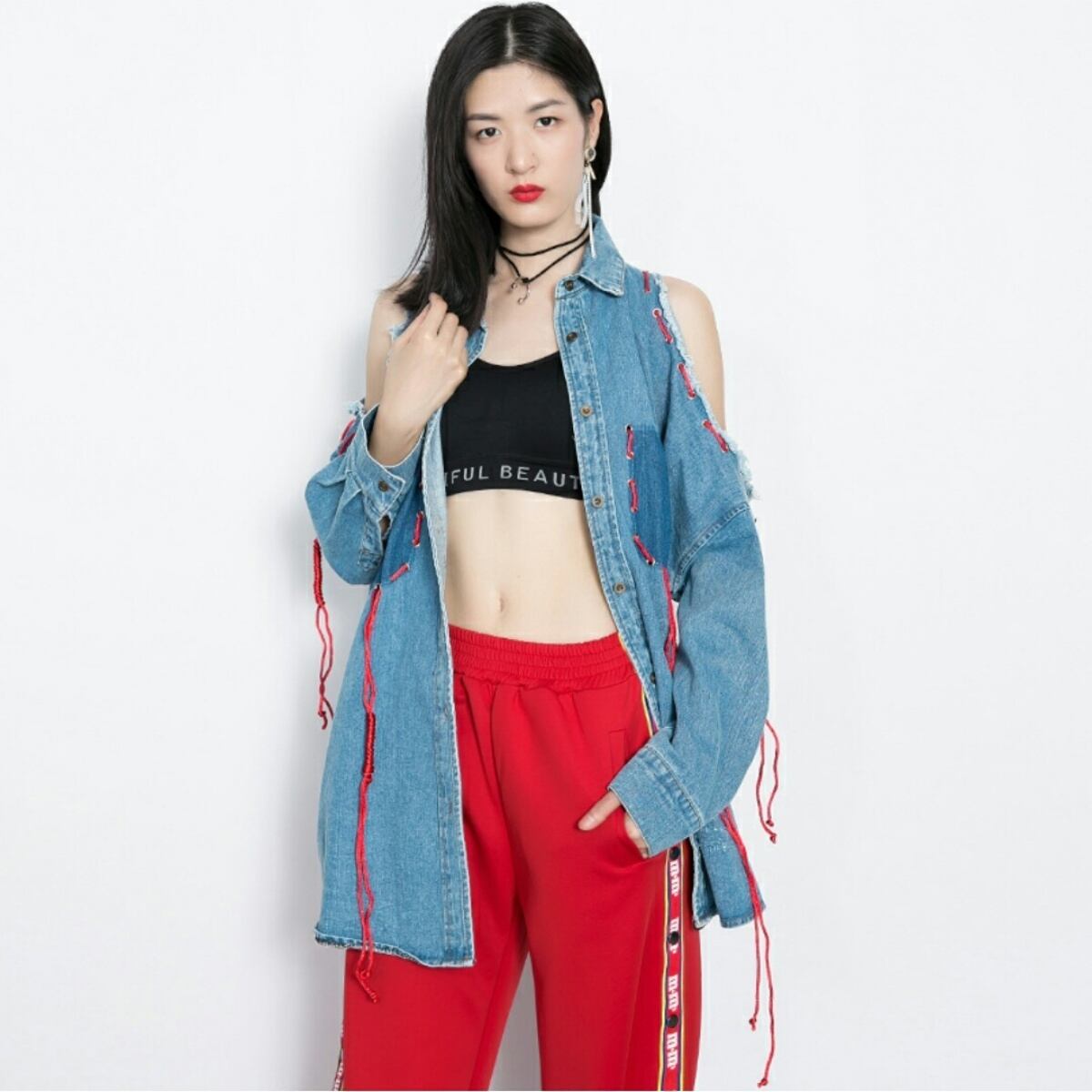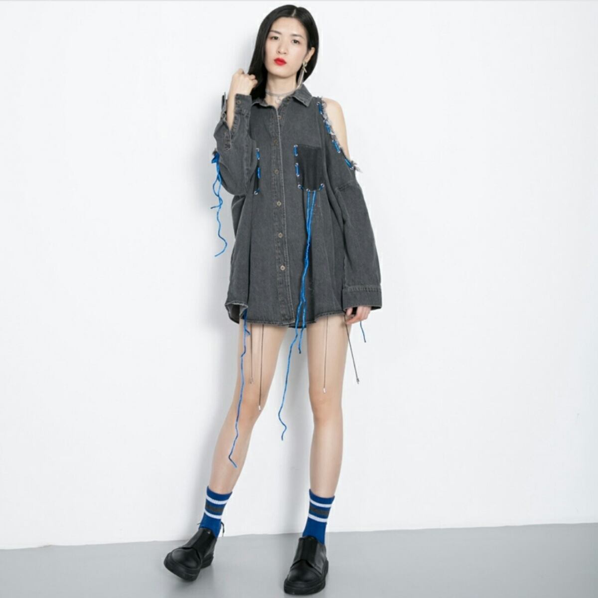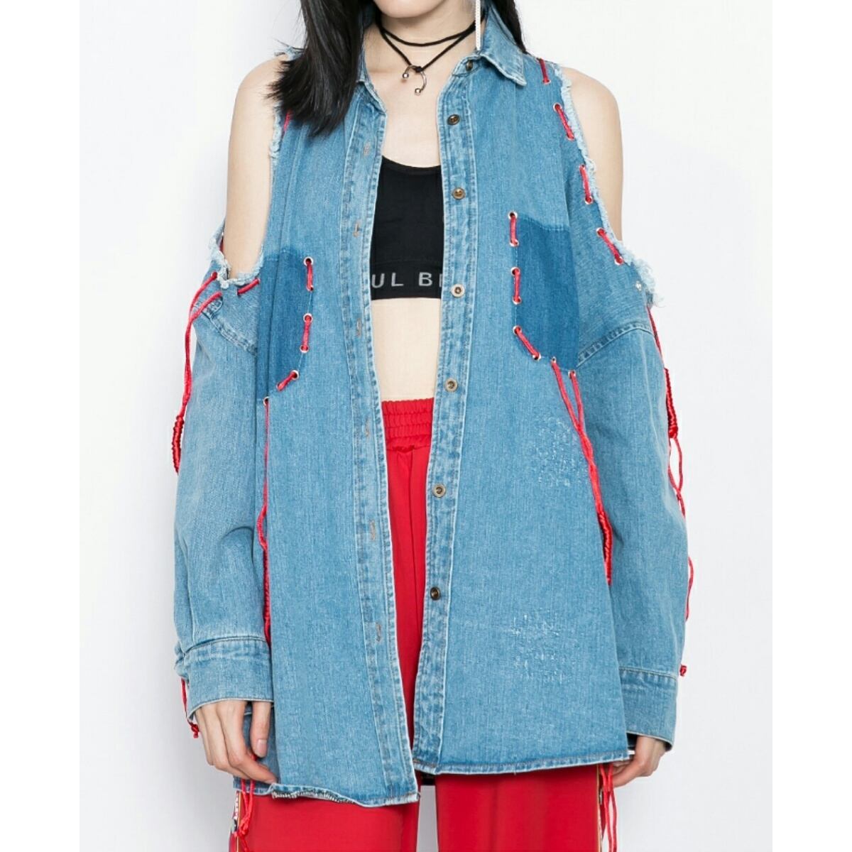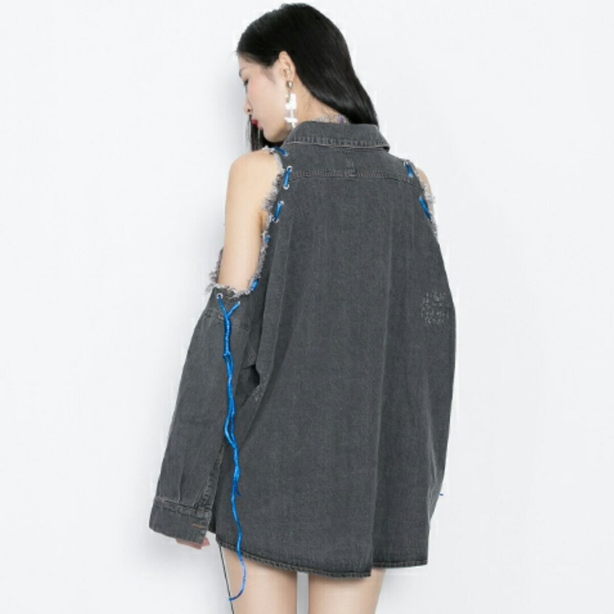 アクセント紐カラーがポイント肩出しデニムアウター黒/青