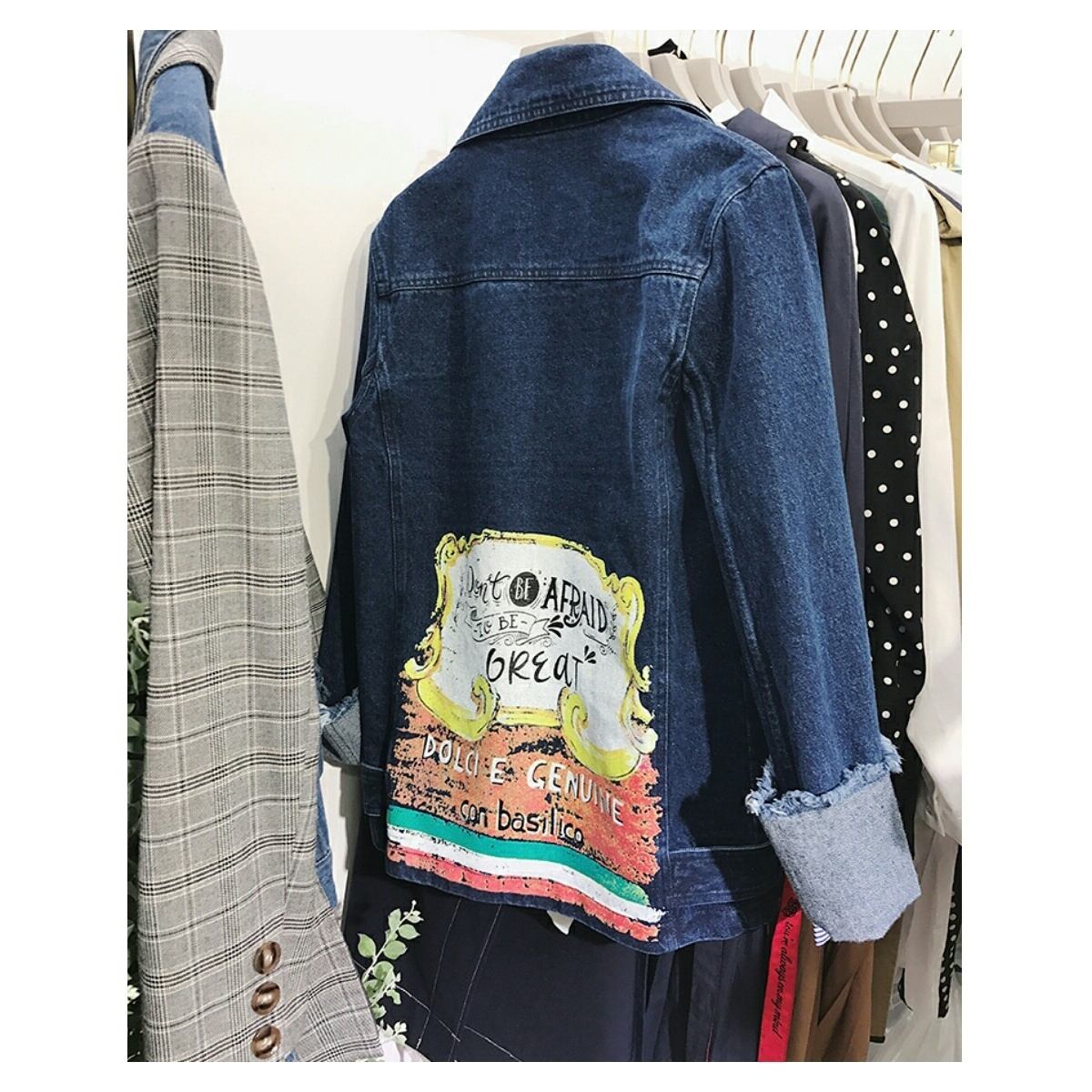 秋コーデバック模様がポイントPOPカラーロゴ入デニムジャケット
