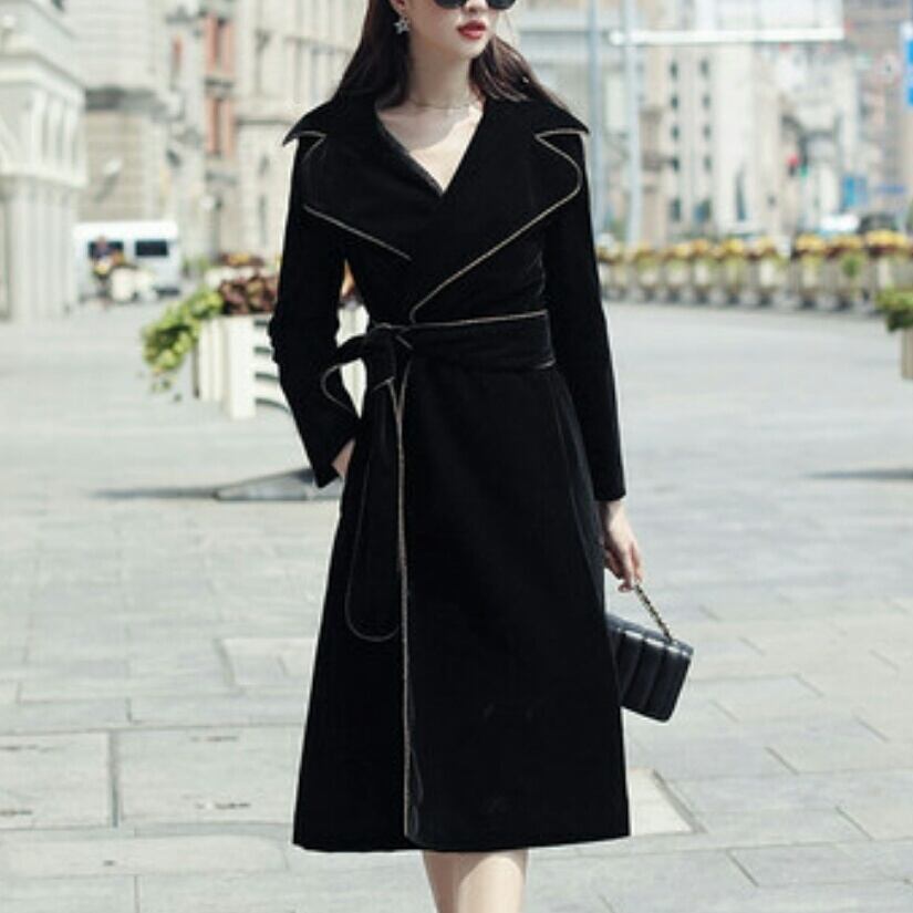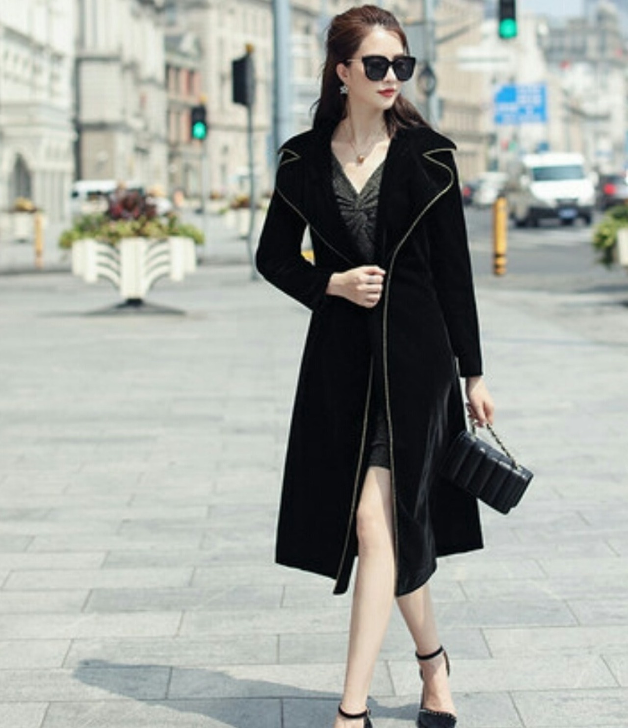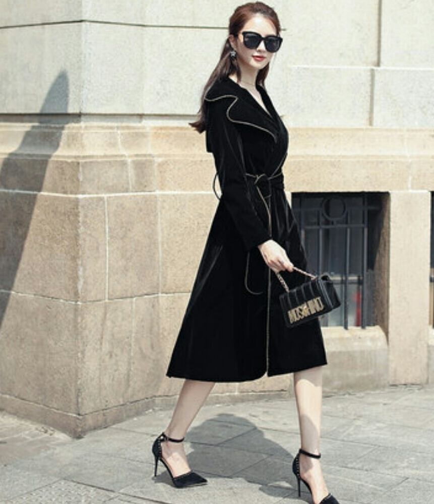 高級感ある重厚な黒のベロア素材/ロング丈トレンチコート