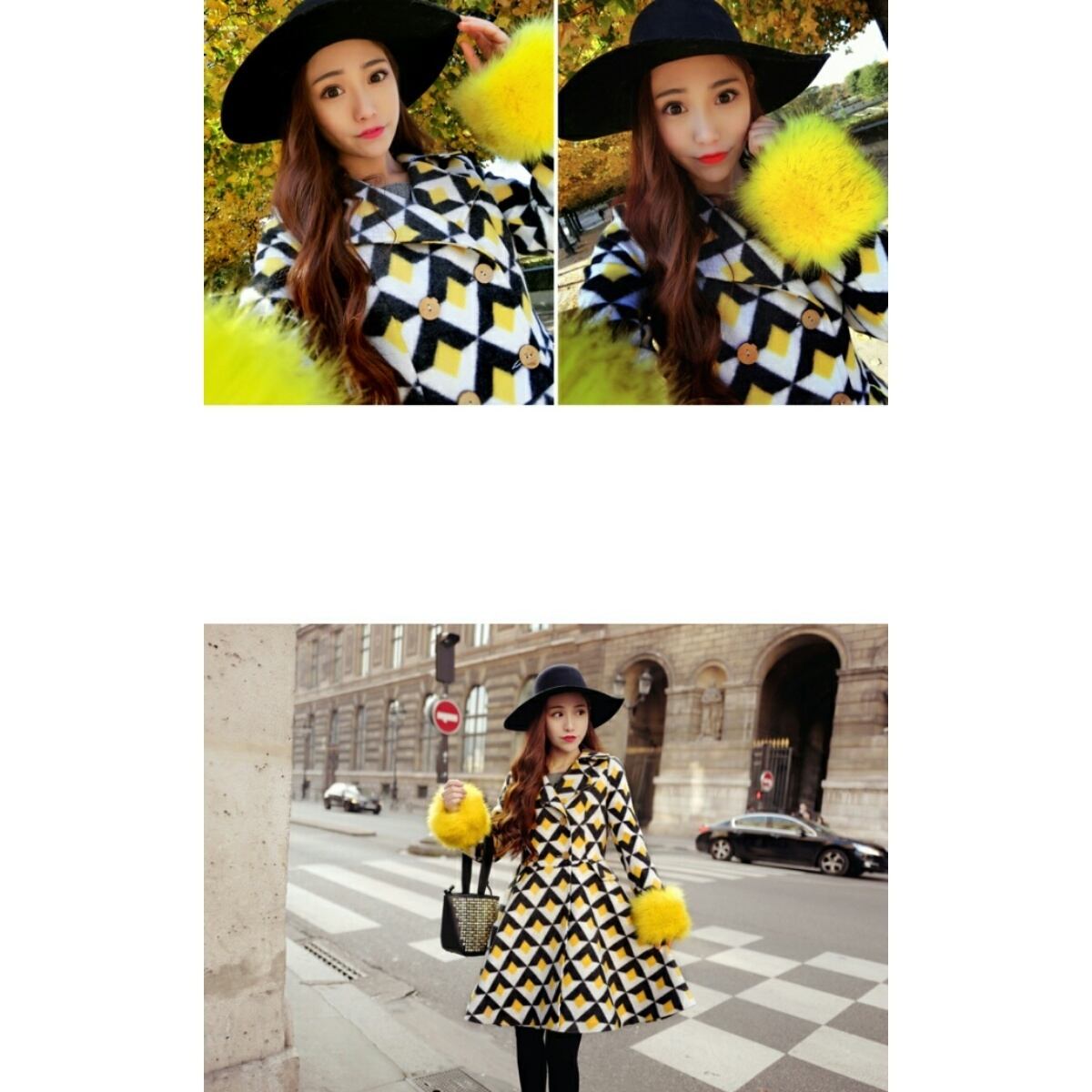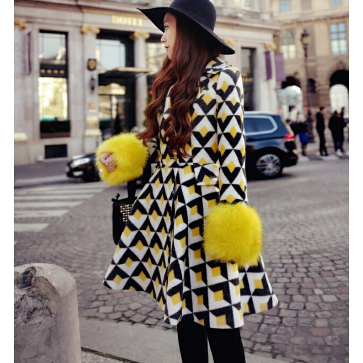 黄色がアクセントのファー付ワンピース風ジオメトリックコート