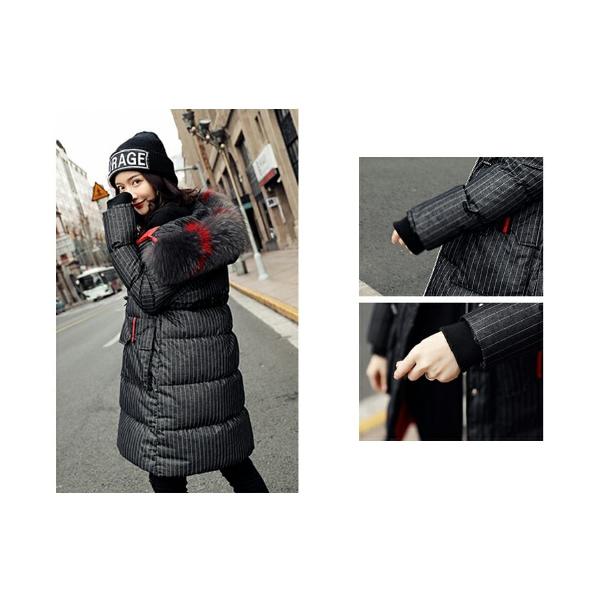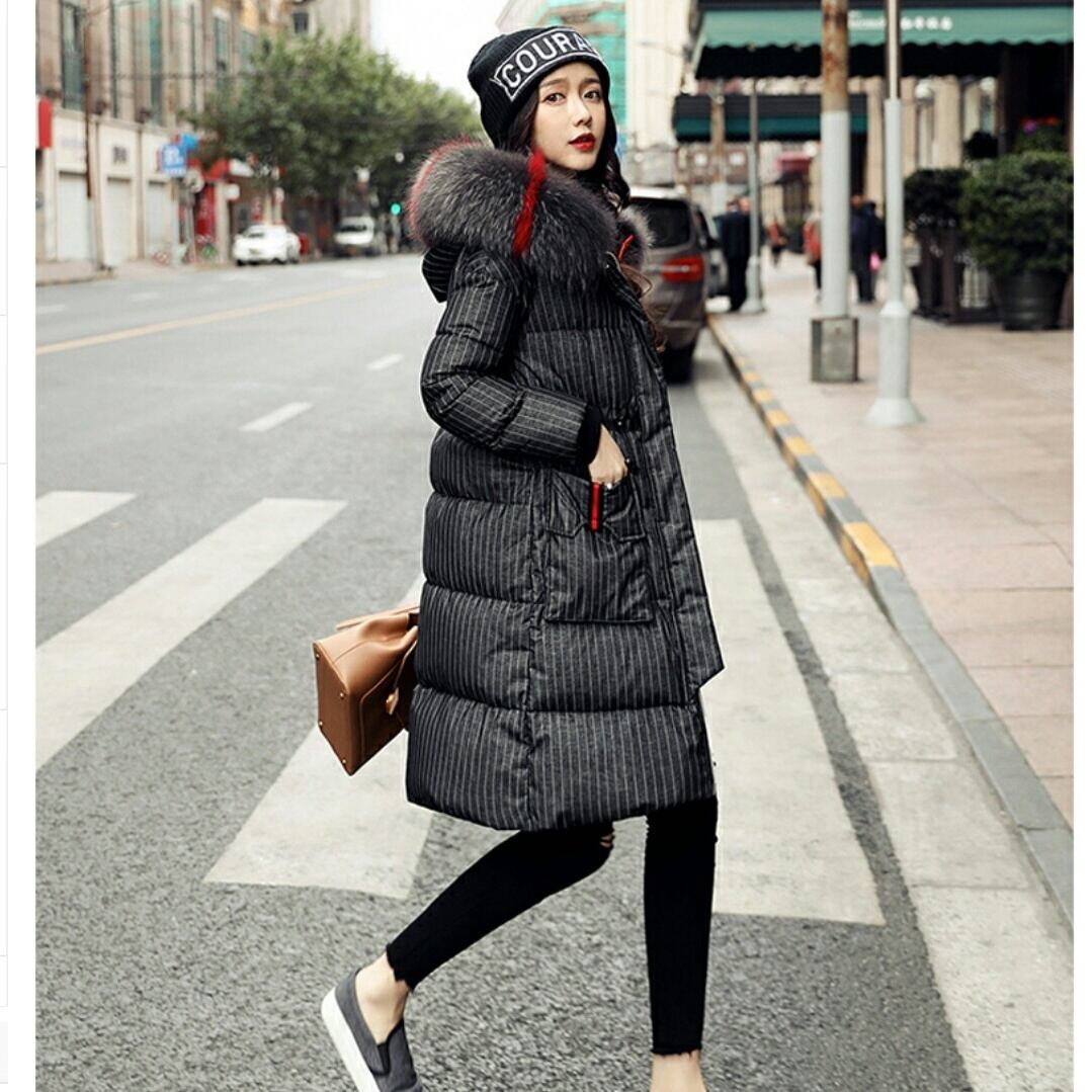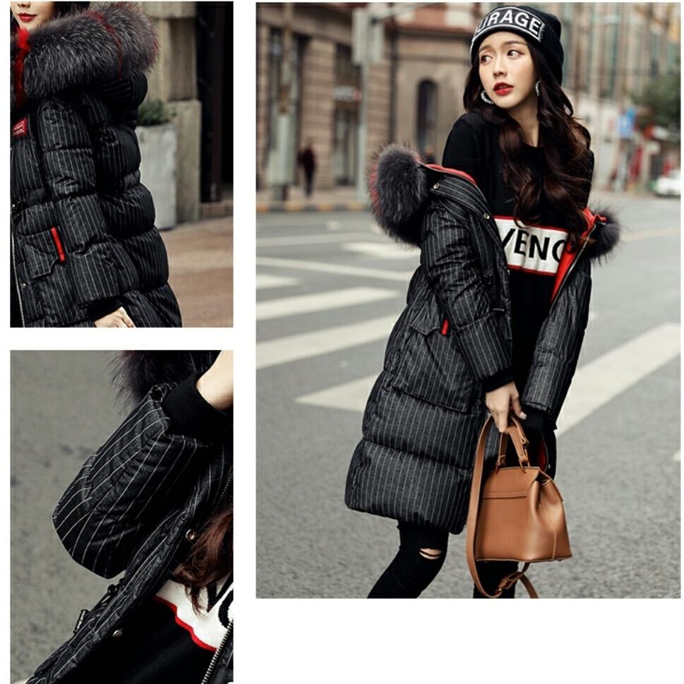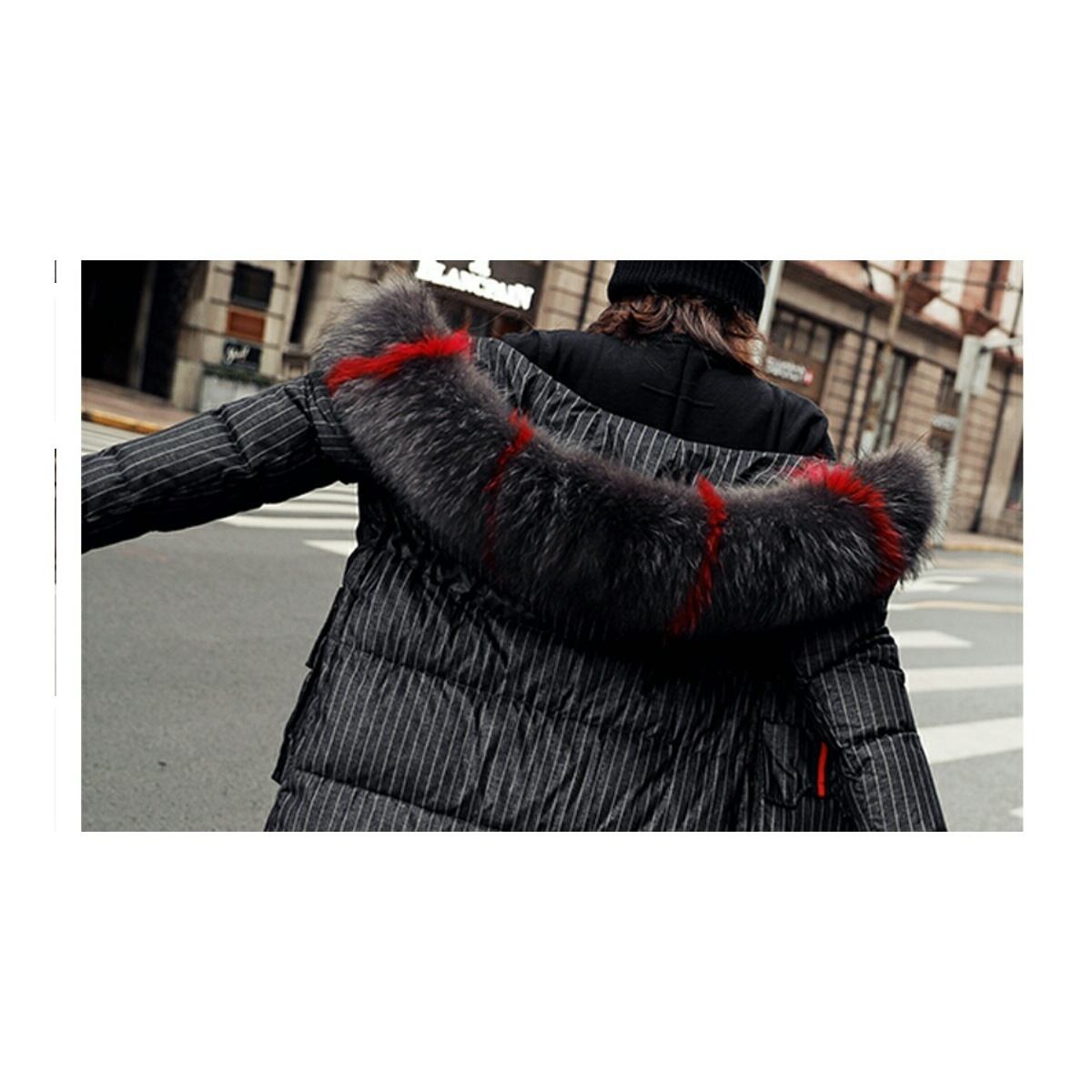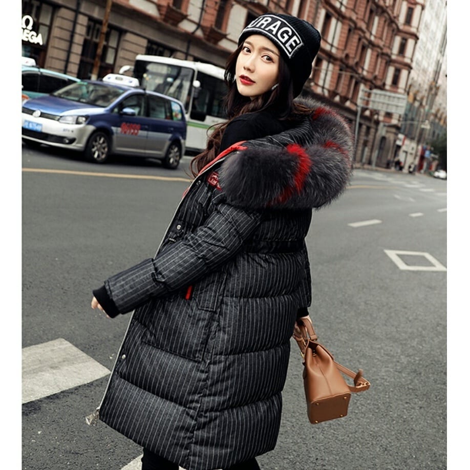 ポイントカラーファーフードがおしゃれストライプダウンコート