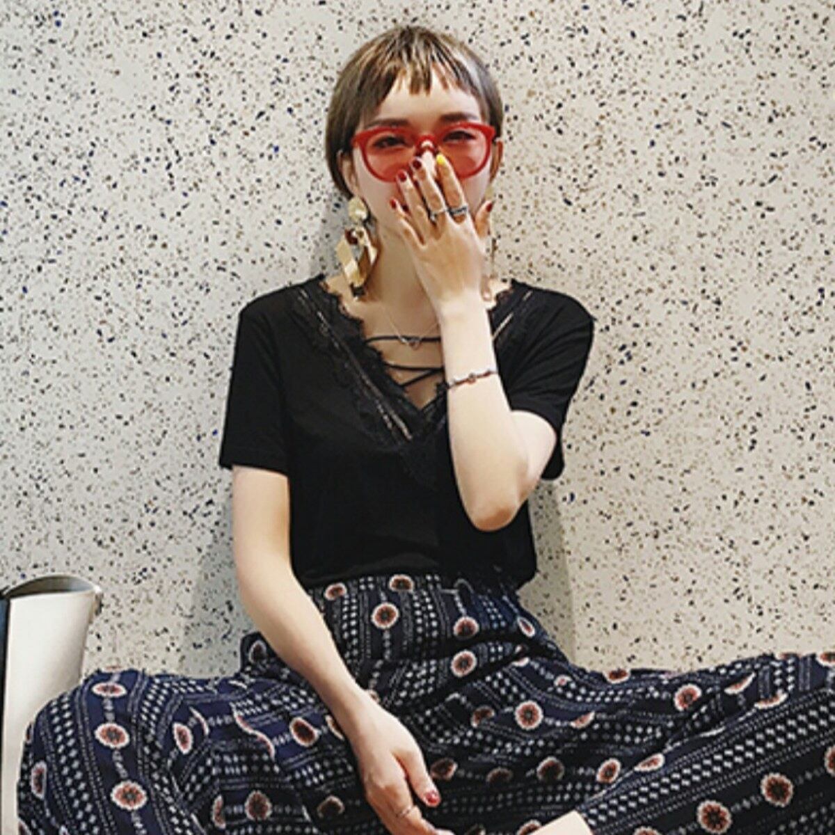 2WAY前後変えてもかわいいポイントレース黒/半袖トップス