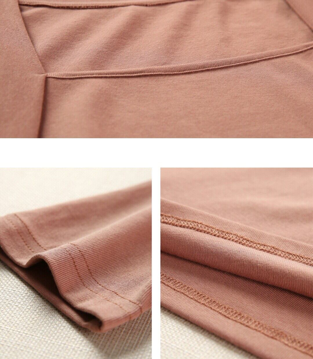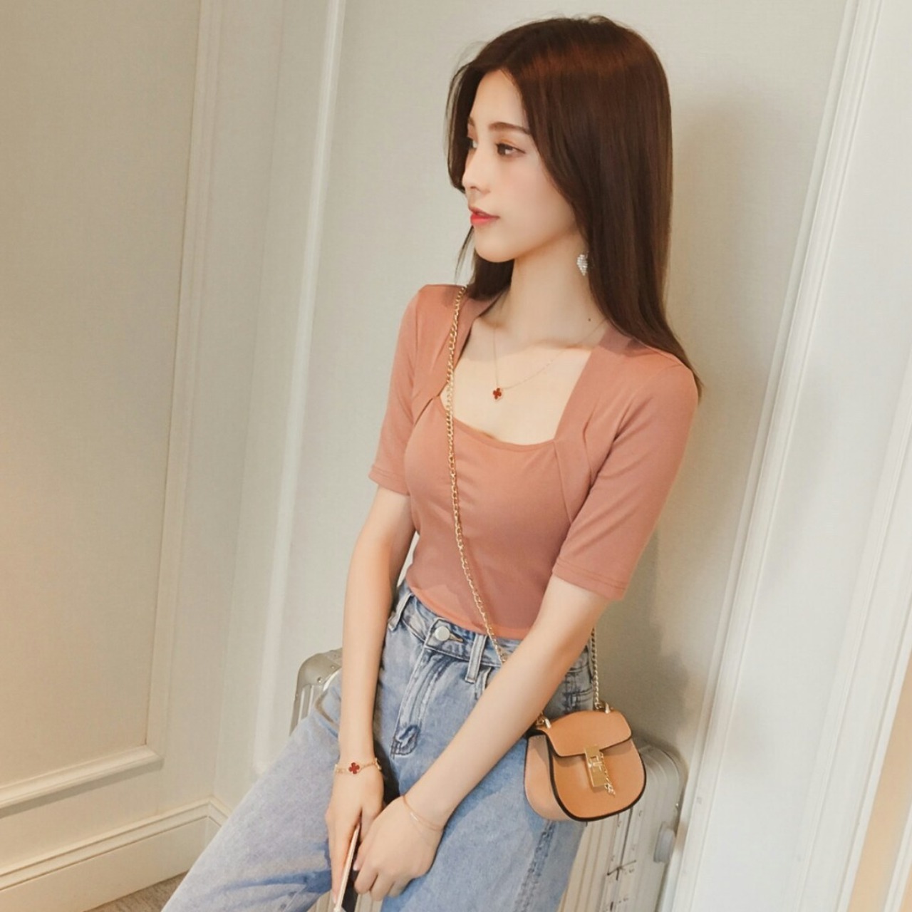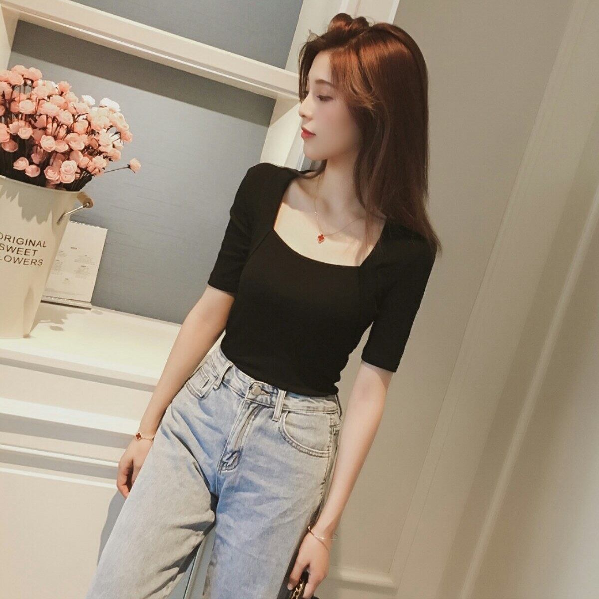 デコルテが綺麗に開いたスクエアネック五分丈トップス黒/茶