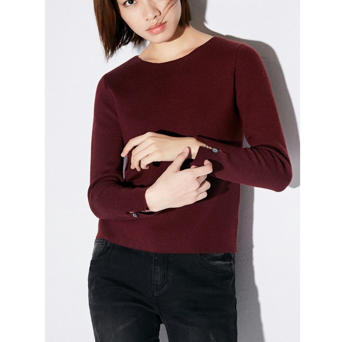 袖ボタンのシンプルなデザインニットトップス/黒/ワイン/緑など
