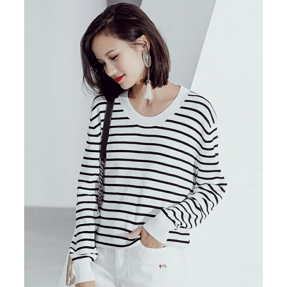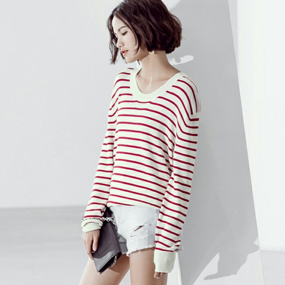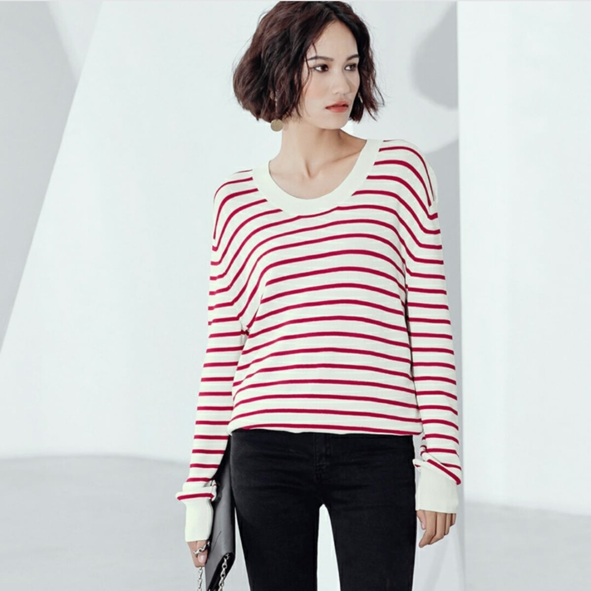 ジーンズとも相性◎Uネックボーダーニットトップス黒/赤