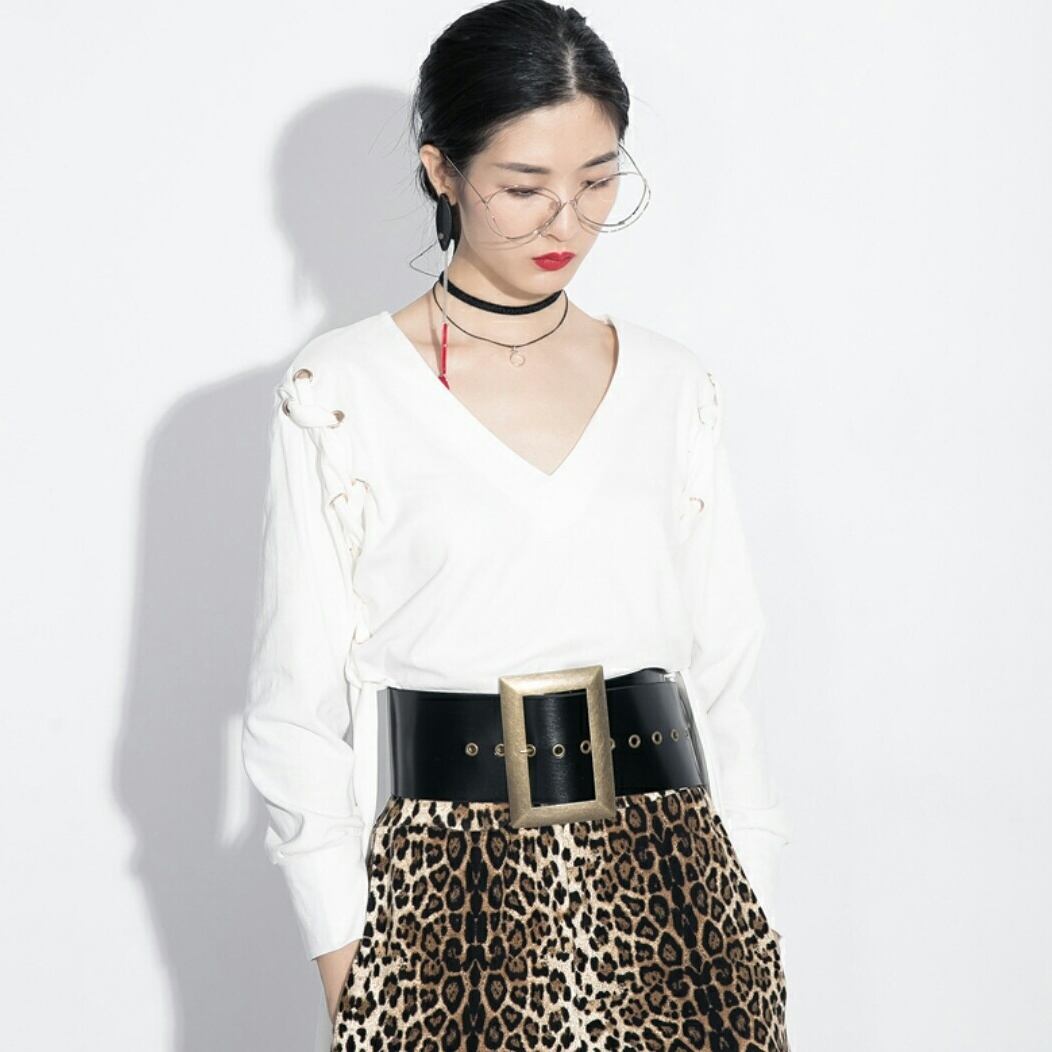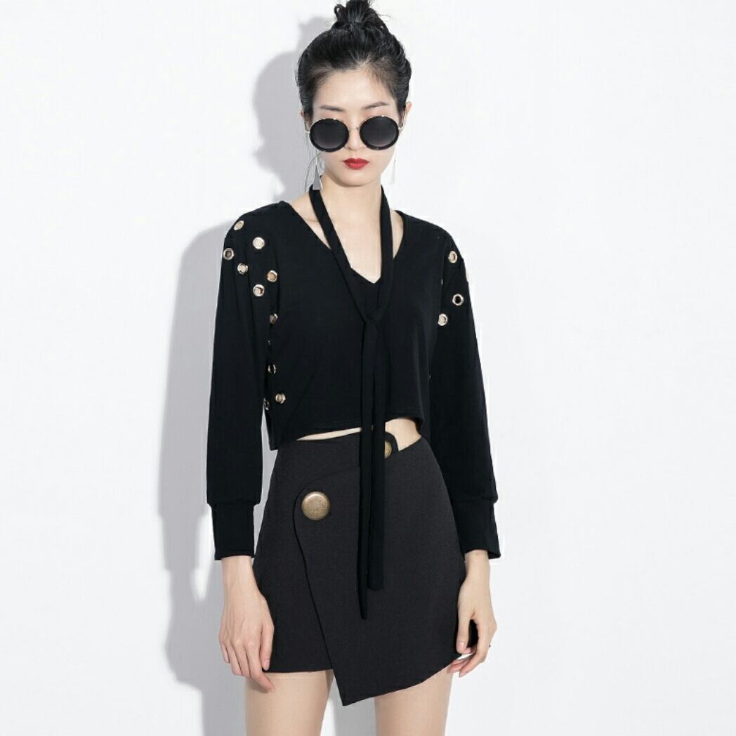 メタルドットがポイントクロップド丈/Vネック長袖Tシャツ黒/白