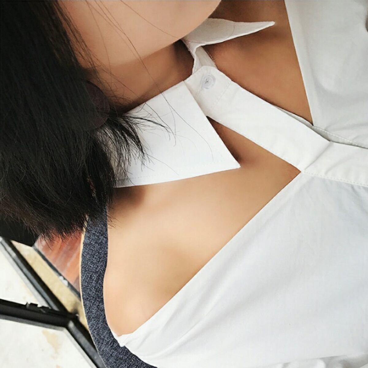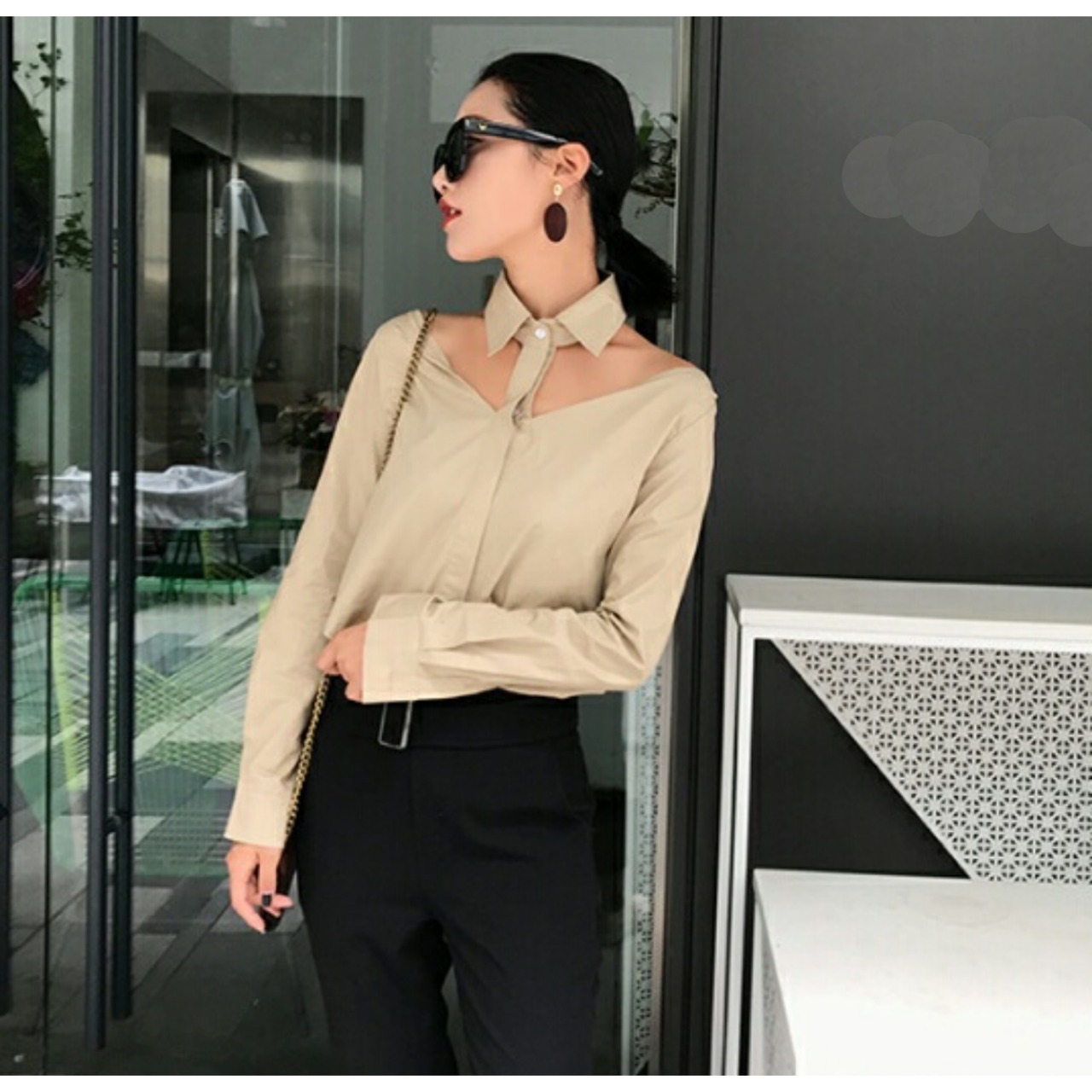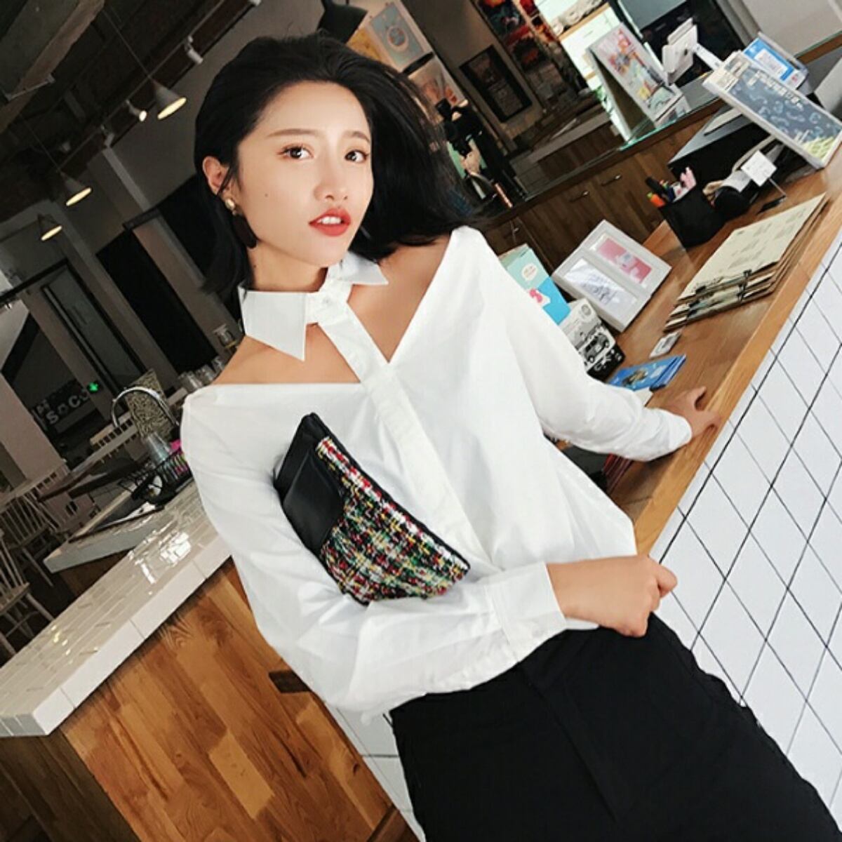 襟付きのデコルテが開いたシンプルなブラウス白/黒/ベージュ