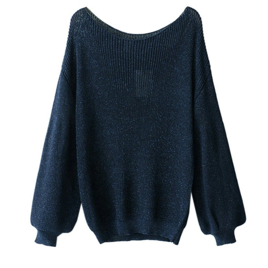 袖ロング&ボリュームのボートネックニットトップス黒ネイビー