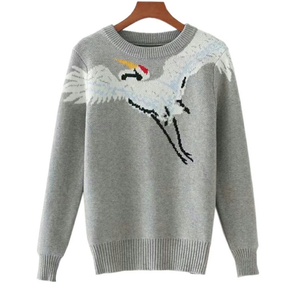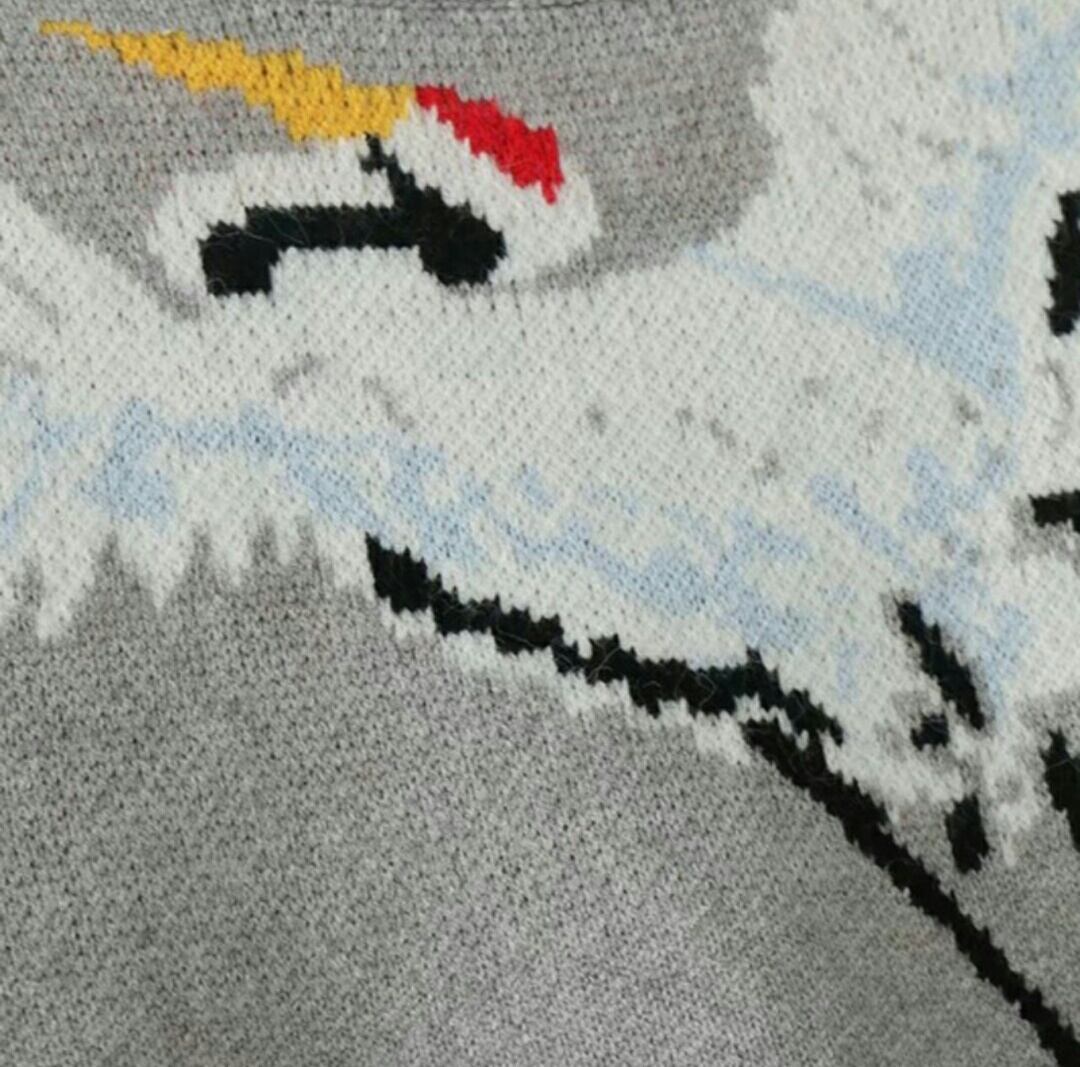 冬コーデに鶴モチーフ模様のニットプルオーバーグレー/ネイビー